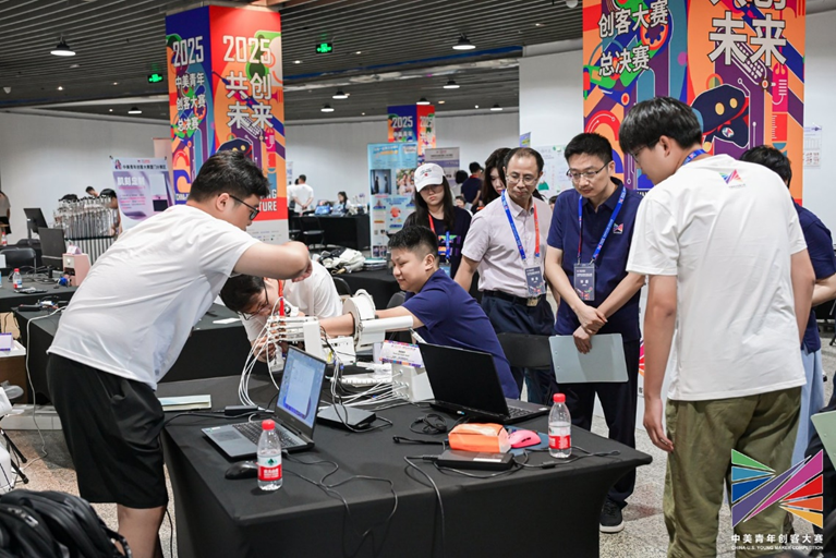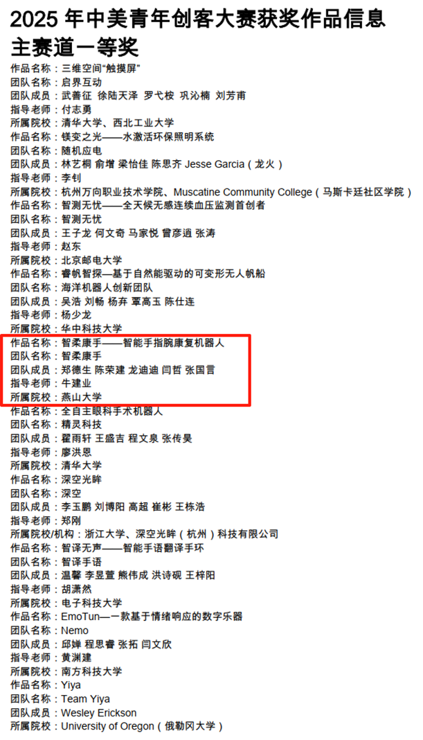 2025年8月2日至4日,由教育部主办,中国(教育部)留学服务中心、清华大学等联合承办的“共创未来”中美青年创客大赛总决赛在北京中华世纪坛举行。本届大赛覆盖中美15个赛区,吸引全球23,500余名青年创客、超4900支团队同台竞技。主赛道共角逐出一等奖10项、二等奖17项、三等奖24项。我院学子历经校赛、区域赛层层选拔,最终以河北省唯一晋级全国总决赛的团队身份挺进国赛。其中《智柔康手—智能手指腕康复机器人》项目凭借创新技术与社会价值深度融合,在总决赛中脱颖而出,斩获主赛道全国一等奖1项。