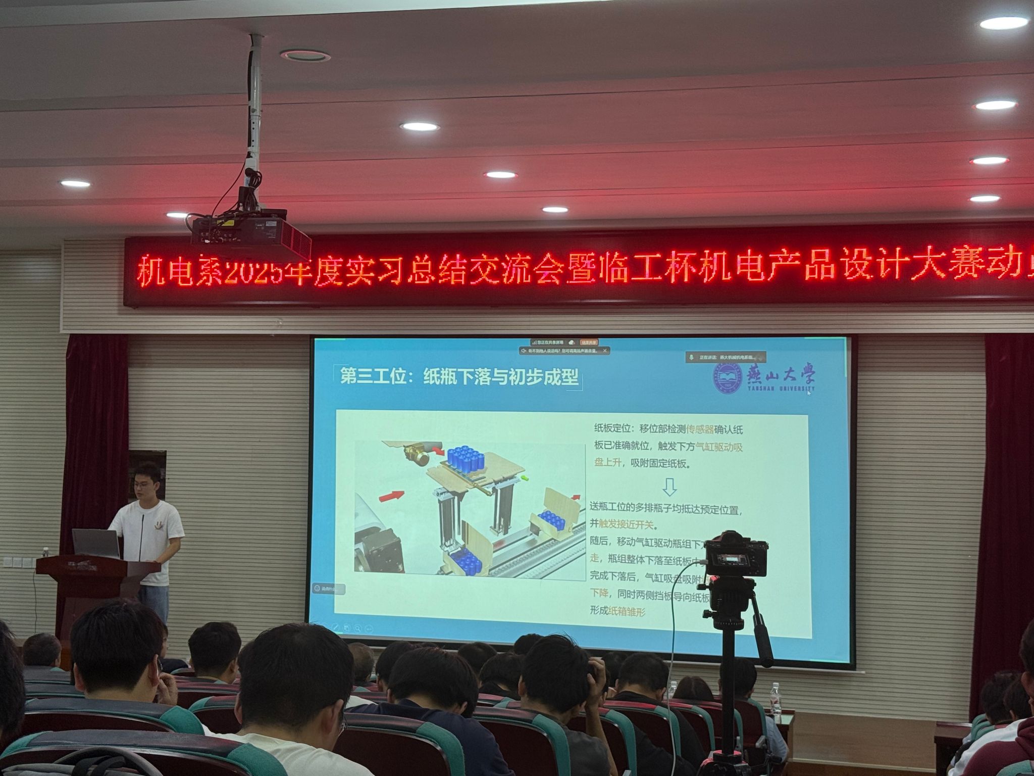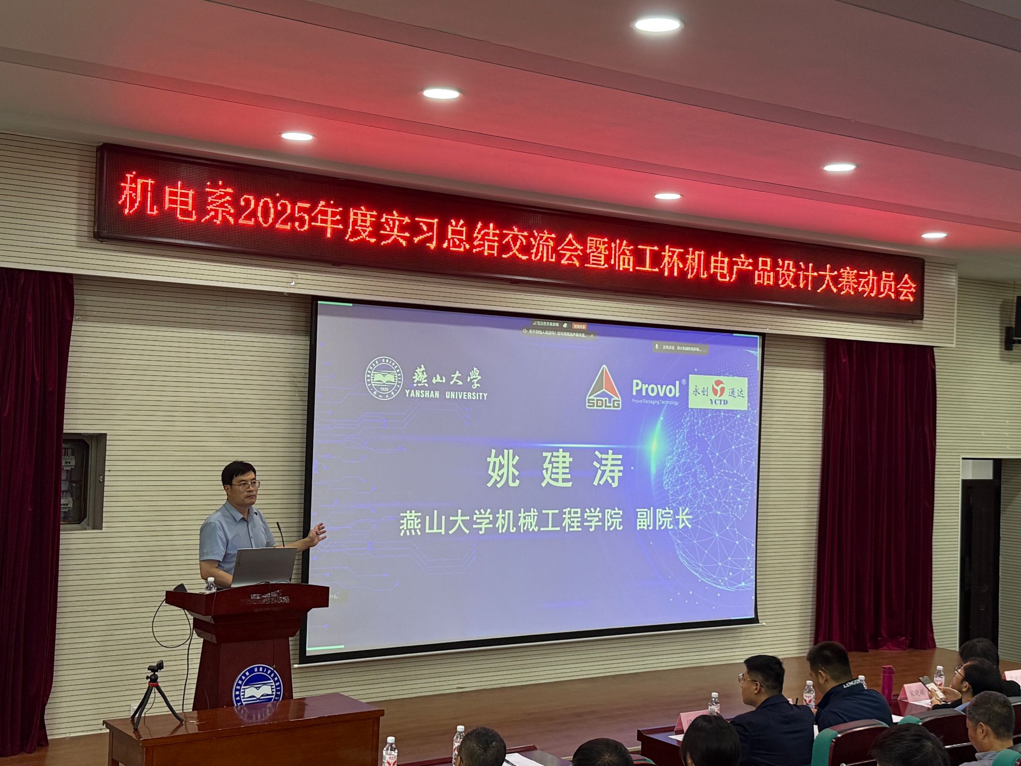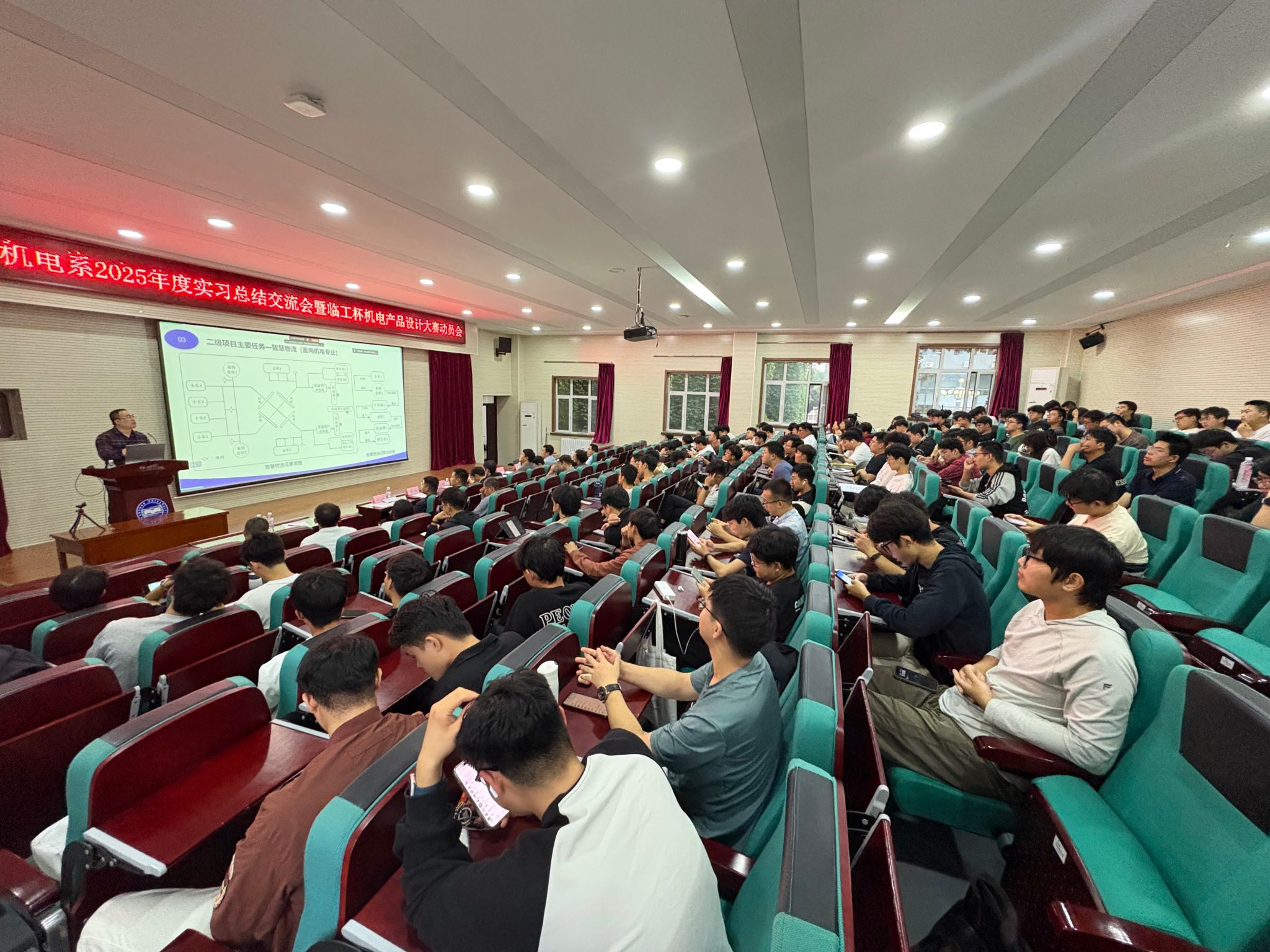 9月23日下午,机械工程学院机械电子工程系(简称“机电系”)在机械馆J3隆重举行了“2025年度实习总结交流会暨临工杯机电产品设计大赛动员会”。会议特别邀请了临工集团常务副总经理宋晓颖、人力资本发展本部经理陈翔和闫凡昌,河北永创通达机械设备有限公司技术总监赵会和,朗锐包装(包装)技术有限公司副总经理李若愚、项目经理侯晓华等企业领导出席本次会议,同时邀请了乌鸦传媒机械工程学院副院长姚建涛出席。机电系主任许允斗、党支部书记边辉、生产实习与二级项目指导教师以及2022级学生共同参加了本次活动。会议由机电系教师李姿葳主持。本次会议还通过“智能制造新工科建设改革虚拟教研室”平台,在腾讯会议上进行了全程直播。