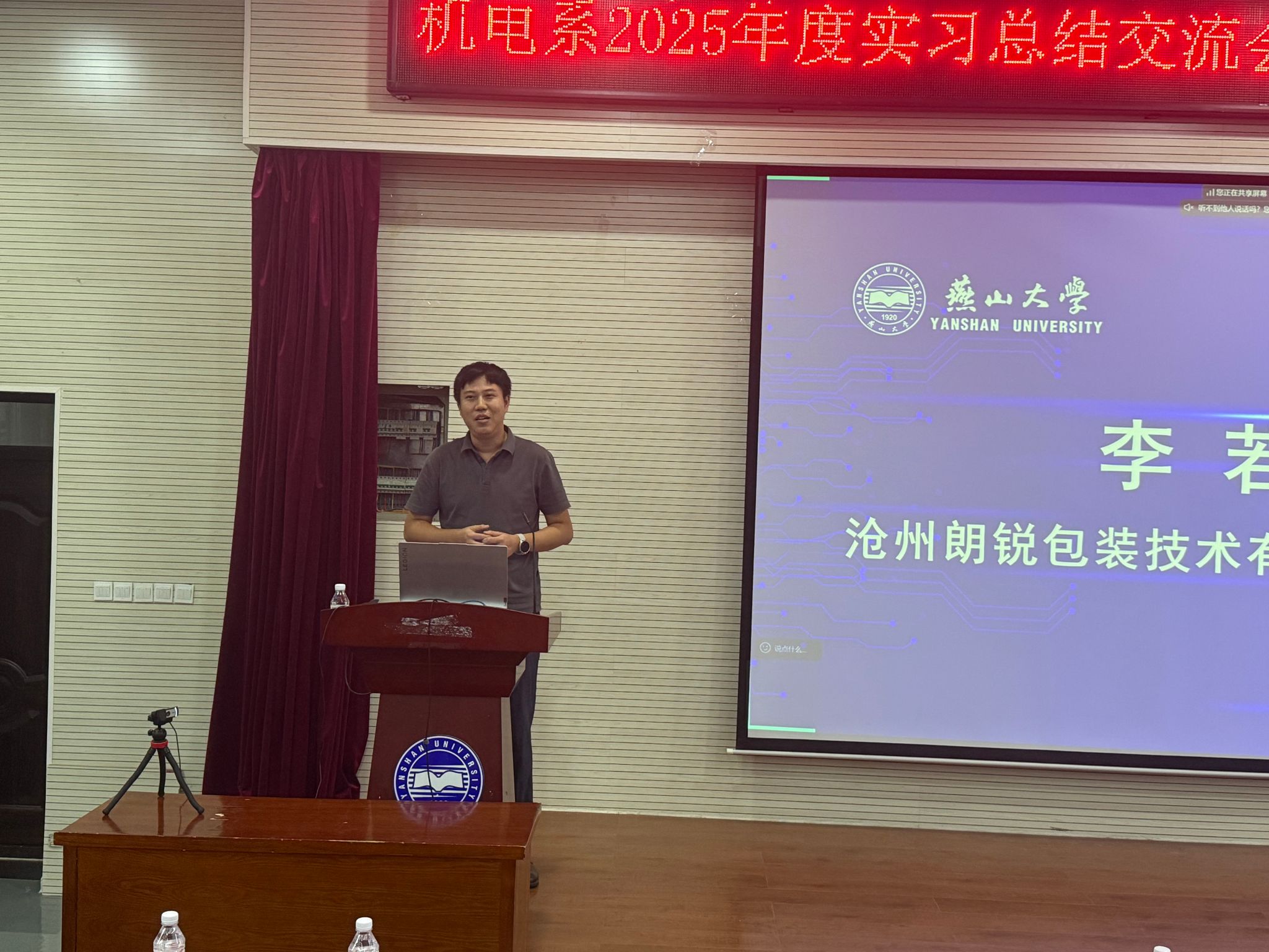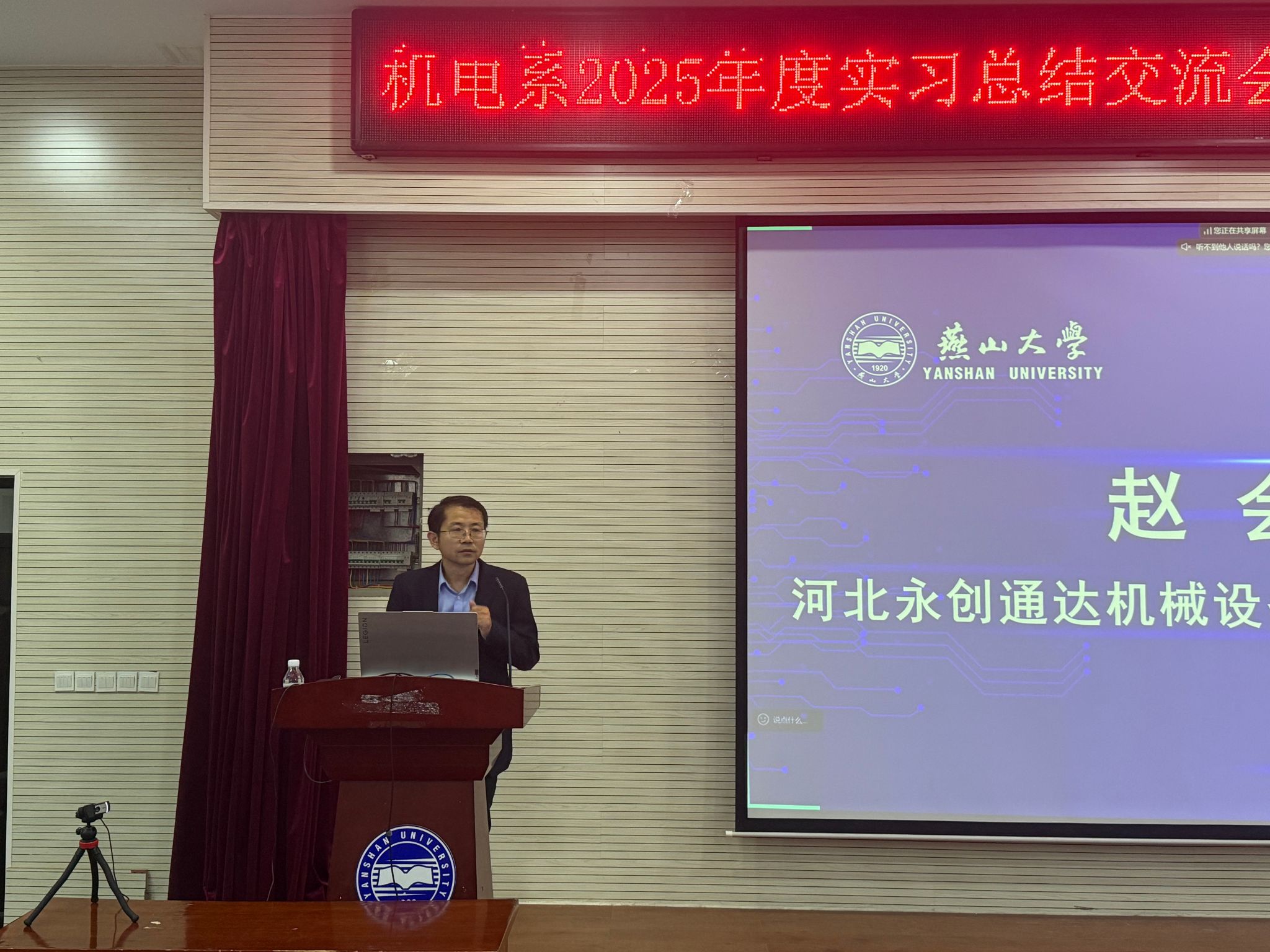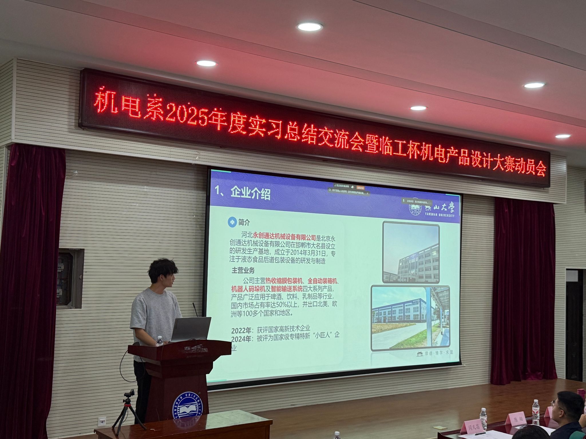 9月23日下午,机械工程学院机械电子工程系(简称“机电系”)在机械馆J3隆重举行了“2025年度实习总结交流会暨临工杯机电产品设计大赛动员会”。会议特别邀请了临工集团常务副总经理宋晓颖、人力资本发展本部经理陈翔和闫凡昌,河北永创通达机械设备有限公司技术总监赵会和,朗锐包装(包装)技术有限公司副总经理李若愚、项目经理侯晓华等企业领导出席本次会议,同时邀请了乌鸦传媒机械工程学院副院长姚建涛出席。机电系主任许允斗、党支部书记边辉、生产实习与二级项目指导教师以及2022级学生共同参加了本次活动。会议由机电系教师李姿葳主持。本次会议还通过“智能制造新工科建设改革虚拟教研室”平台,在腾讯会议上进行了全程直播。