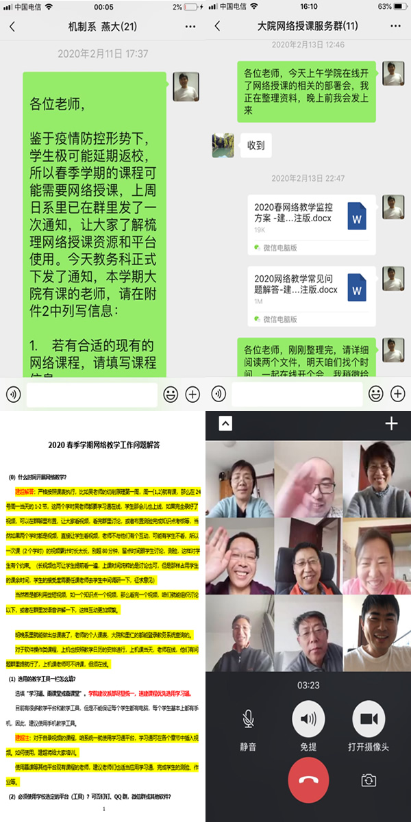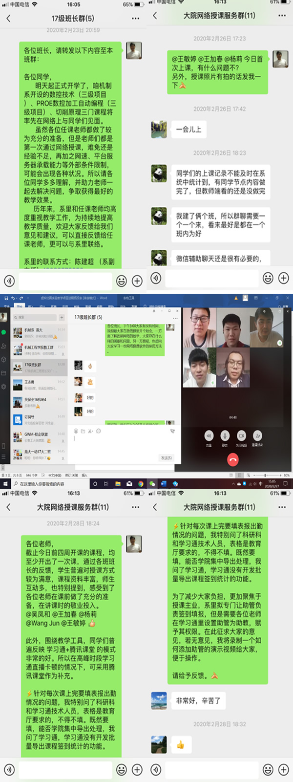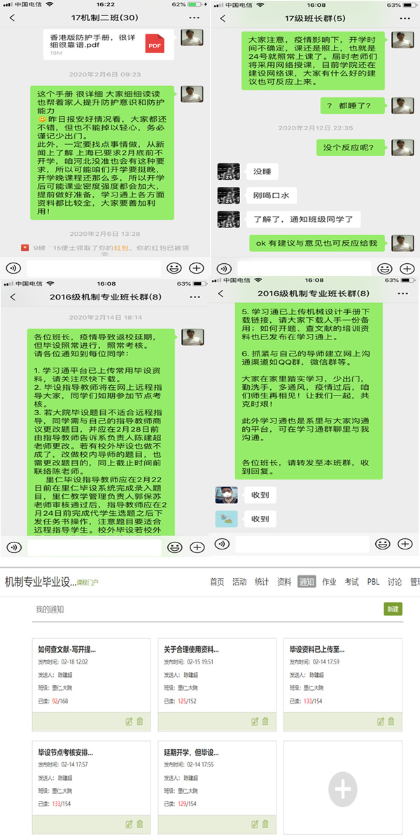 2020年2月11日,原计划开学日的前10天,当时疫情非常地焦灼,持续上升的重症病例、确诊病例、死亡病例等敏感的数字令师生感到揪心的伤痛和不安,按时开学的希望也越来越渺茫。就在这天,学校和学院为保证学生“停课不停学”迅速部署了本科网络教学方案。机械制造及其自动化系(简称机制)迅速响应,一方面组织本学期任课教师调研线上已有的课程资源,加紧试用各个网络学习软件平台;另一方面提前与学生沟通,让学生提前沉下心来等待线上学习,并向学生征集网上授课的意见与建议。