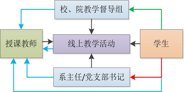 2020年2月14日,机制系组织任课教师召开网络视频会议,会上老师们交流了调研成果,学生反馈的建议,以及一起学习了学院网络教学工作指导文件,并对未来授课中可能存在的问题及解决方法展开了讨论,确定了学习通为机制系主要网络教学平台,同时为保证教学能够可靠地推进,也确定了微信群、腾讯会议、腾讯课堂等平台作为应急授课渠道。会后,系里进一步制订并完善了《机械制造及其自动化系疫情防控期间本科教学工作方案》,确定了以校院督导组、系主任/党支部书记、任课教师与学生四方参与的教学质量持续改进体系。从保障体系图中可见,教学以学生为主体,他们的意见可直接反馈给任课教师,也可通过校、院、系渠道反馈。而校、院、系等在上课中也随时旁听教学活动,从中总结问题与建议,直接反馈给任课教师。此外,教师每日授课后反思,再加之学生、校、院和系多方提出的建议可一同帮助教师持续地改进教学,提升教学效果。