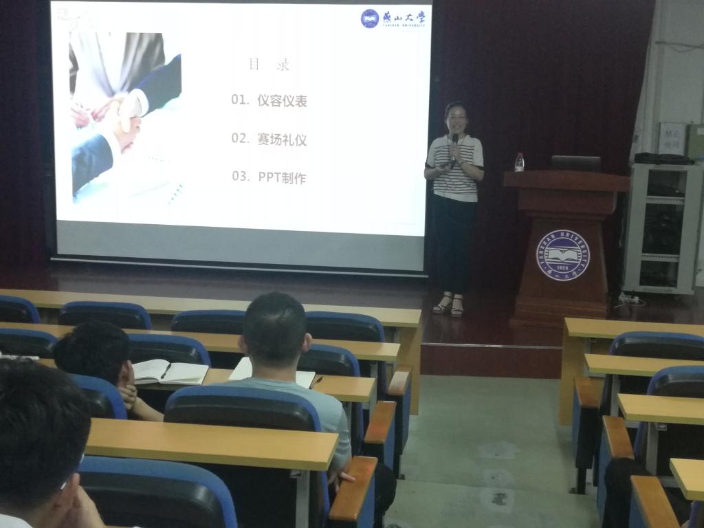 王老师的讲座以“互联网+大学生创新创业大赛赛前礼仪培训”为主题,从仪容仪表,赛场礼仪,PPT的制作三个方面进行讲解,向我院参加比赛的同学进行了细致的赛前培训,并与现场同学进行互动,让同学上台展示礼仪举止,更传授了很多答辩时的小技巧。