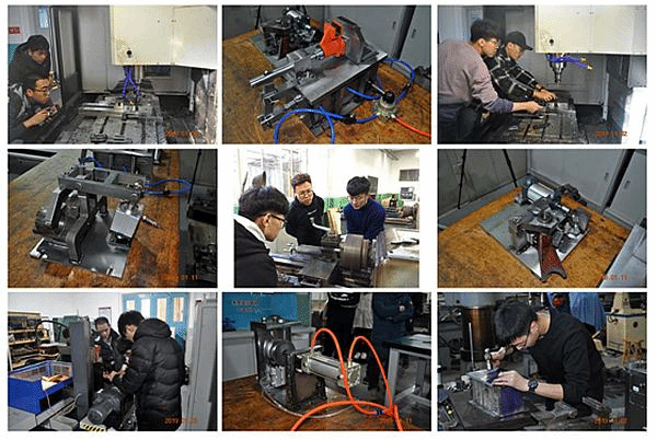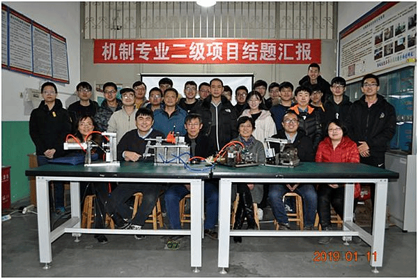 此次验收展演汇报分为4组进行,每组的夹具型号、定位夹紧方案各异。每组同学都对自己的作品做了精彩的ppt讲解、项目实施过程视频剪辑展示和运行演示。在汇报中,同学们均表示实物制作过程非常辛苦,也非常考验耐心,但这一过程也真正让他们懂得了做机械设计一定要面向制造,面向成本,具备优良工艺性与经济性的设计才是最佳的设计,能够落地的设计。会后各班总工组成员及部分技术组成员与指导教师团队合影留念。