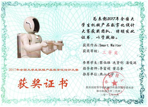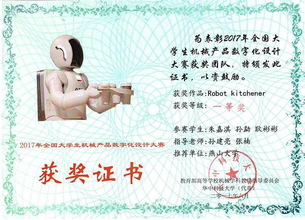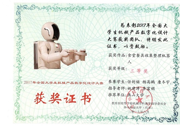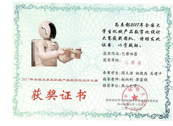 2017年6月2日—4日,由国家级实验教学示范中心联席会机械学科组承办的“全国大学生机械产品数字化设计大赛”在武昌首义学院(武汉)举行,学院高度重视此次学生的参赛,从去年11月份开始组织学生积极参与,并组织多位专家老师进行了多次选拔与评审,最终学院推荐7组作品报名参加全国决赛,我院4支队伍进入全国决赛名单,并赴现场比赛,经过“现场答辩”和“现场命题设计与制作”两个环节,其中Robot Kitchener(参赛学生:朱嘉淇,孙勐,耿彬彬,指导教师:孙建亮、张楠)获得全国决赛一等奖,食堂餐具收集整理机器人(参赛学生:任则铭, 杨高鹏, 唐冬宇,指导教师:姚建涛、李富娟)、巴黎味蕾(参赛学生:周文源, 姚敬禹, 吴建平,指导教师:赵炳利、李富娟)和Smart Waiter(参赛学生:黎伯雄, 冼贤钊, 潘俊廷,指导教师:李富娟、董志奎)获得全国决赛三等奖。