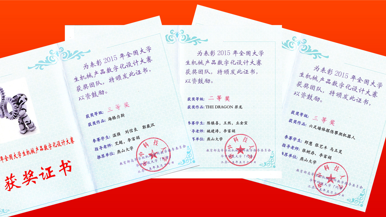 2015年5月15日—17日,由国家级实验教学示范中心联席会机械学科组承办的“全国大学生机械产品数字化设计大赛”在华中科技大学(武汉)举行,学院高度重视此次学生的参赛,从去年11月份开始组织学生积极参与,并组织多位专家老师进行了多次选拔与评审,最终学院推荐10组作品报名参加全国决赛,我院3支队伍进入全国决赛名单,并赴现场比赛,经过“现场答辩”和“现场命题设计与制作”两个环节,其中THE DRAGON羿龙(参赛学生:陈镇喜,王然,丘金宣,指导教师:姚建涛、李富娟)获得全国决赛二等奖,六足墙体探伤攀爬机器人(参赛学生:郅慧,张艺丰,马玉昊,指导教师:张树存、李富娟)和海格力斯(参赛学生:温强,刘信良,郭巍汉,指导教师:艾超、李富娟)获得全国决赛三等奖。