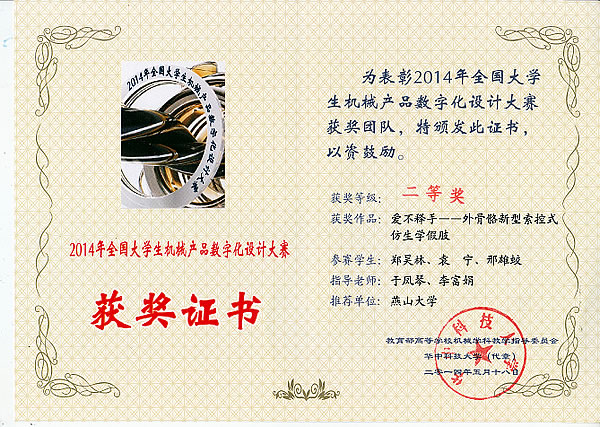2014年5月16日—18日,由国家级实验教学示范中心联席会机械学科组承办的“全国大学生机械产品数字化设计大赛”在华中科技大学(武汉)举行,学院高度重视此次大赛,从去年11月份开始组织学生积极参与,并组织多位专家老师进行了多次选拔与评审,最终学院推荐6组作品报名参加全国决赛,其中3支队伍进入全国决赛名单,并赴现场比赛,经过“现场答辩”和“现场命题设计与制作”两个环节,其中爱不释手——外骨骼新型索控式仿生学假肢(参赛学生:郑昊林、袁宁、邢雄蛟,指导教师:于凤琴、李富娟)获得全国决赛二等奖,仿螃蟹六足玩具(参赛学生:张帆、王政、王宏博,指导教师:汪飞雪、李富娟)和战地之王—玩具汽车(参赛学生:李浩杰、刘路飞、吴威威,指导教师:于凤琴、李富娟)获得全国决赛三等奖,另外有2组作品获得场外三等奖。