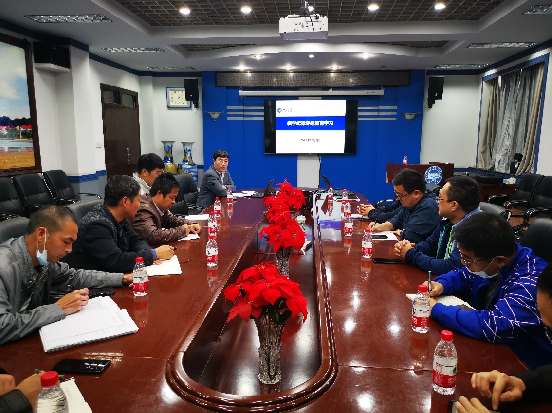 姚建涛首先带领大家学习《高等学校教师职业道德规范》、《新时代高校教师职业行为十项准则》、《教育部关于高校教师师德失范行为处理的指导意见》、《关于加强和改进新时代师德师风建设的意见》等文件。并对各系部提出几点要求:一是要进一步加强教师队伍建设以及理想信念教育。二是要从实际出发把相关文件精神转化为具体的任务举措,把各项要求融入到教师管理的各环节。三是要大力树立和宣传优秀教师先进典型,创新工作机制和有效载体。