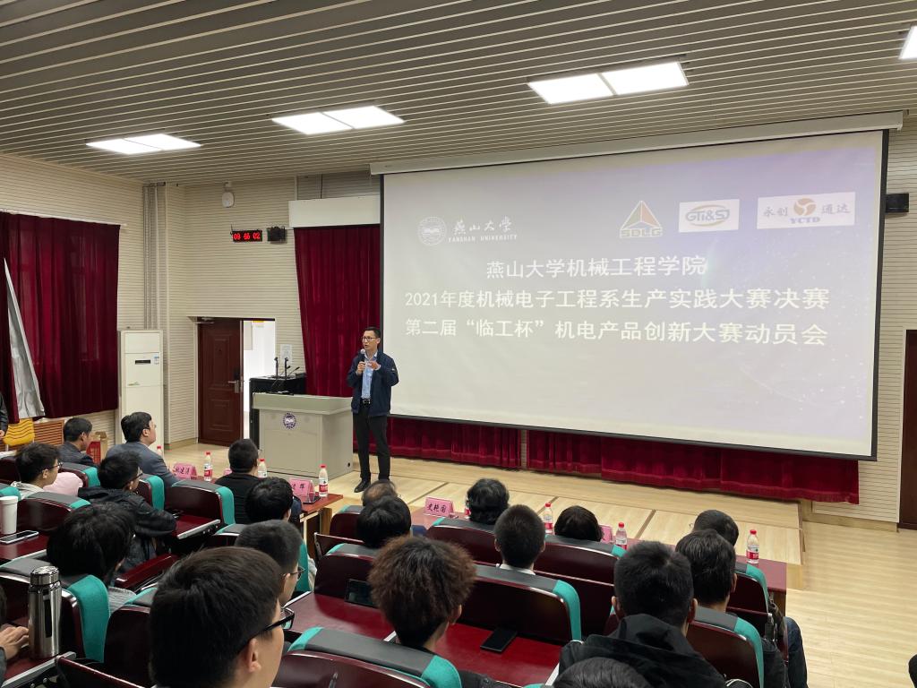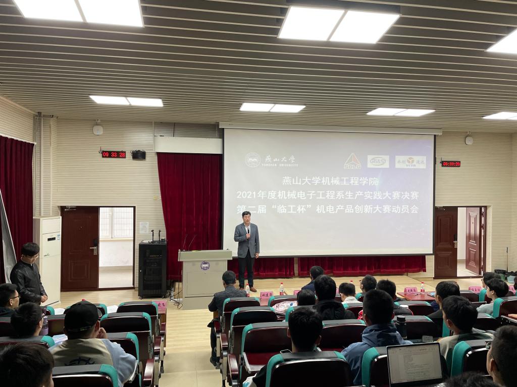 10月10日,2021年度机电系生产实践大赛决赛暨第二届“临工杯”机电产品创新大赛动员会在第四教学楼成功举行。机械工程学院副院长姚建涛、山东临工工程机械有限公司人力资本发展本部部长助理陈亮亮、机电系主任金贺荣、副主任边辉、机电系生产实习、二级项目指导教师和机电系2018级学生出席了本次活动。大赛由刘晓飞老师主持。