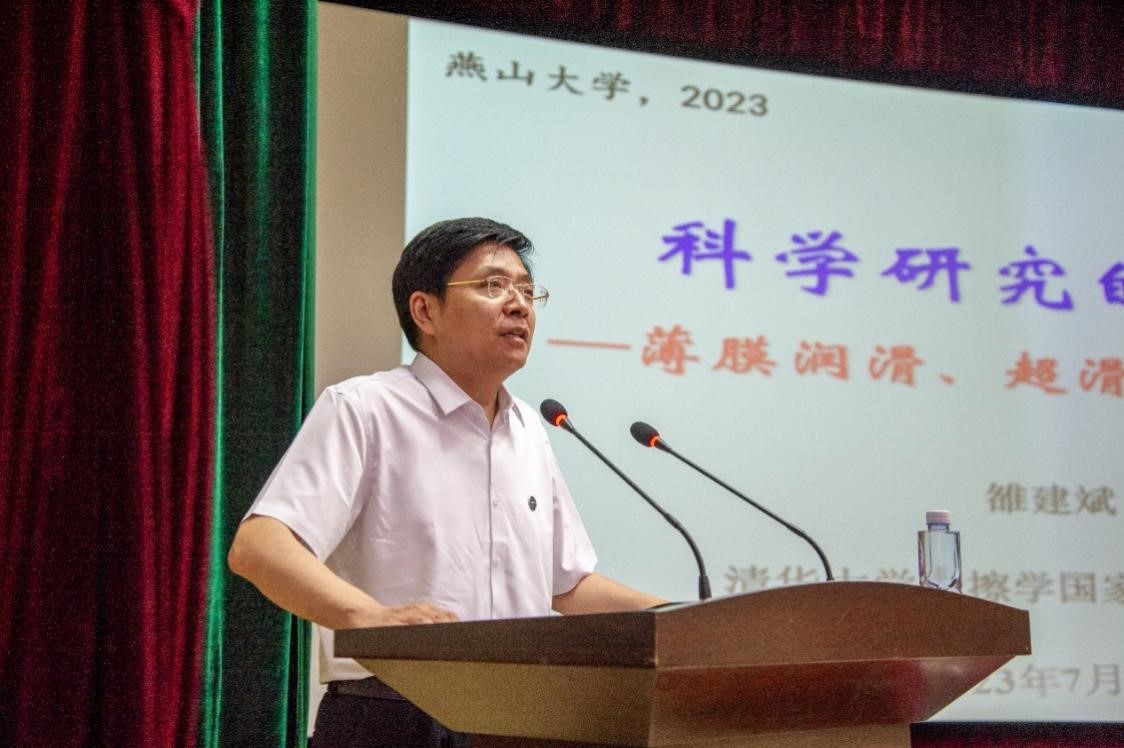 在随后的报告会上,雒建斌院士提出现代大学培养目标、办学理念及办学机制必须顺应时代之变,应具有创新性和引领性。随后,院士又结合自己摩擦领域科研创新之路谈了7点体会。讲述科研选题方法,告诉燕大师生科研无坦途,艰难之日就是突破之时。做学问要大胆假设,认真求证,不放过任何有疑问之处。为人要大气,研究要小气,强调细节决定科研成败。此外,院士还反复强调持之以恒、勤奋努力的重要性,“板凳要坐十年冷,文章不写半句空”。同时,在科研中要注重团队培养,重视团队作战和多学科交叉合作。通过此次讲座,师生就“如何做科研”深受启迪,深刻体会到院士孜孜不倦、严谨求真的科学精神。