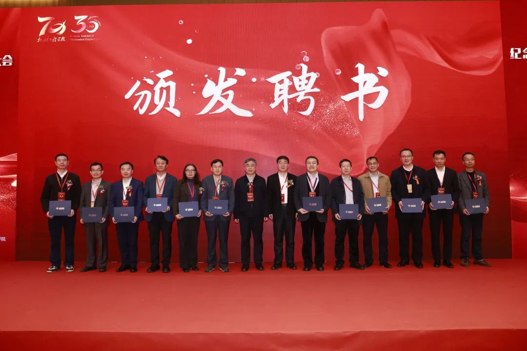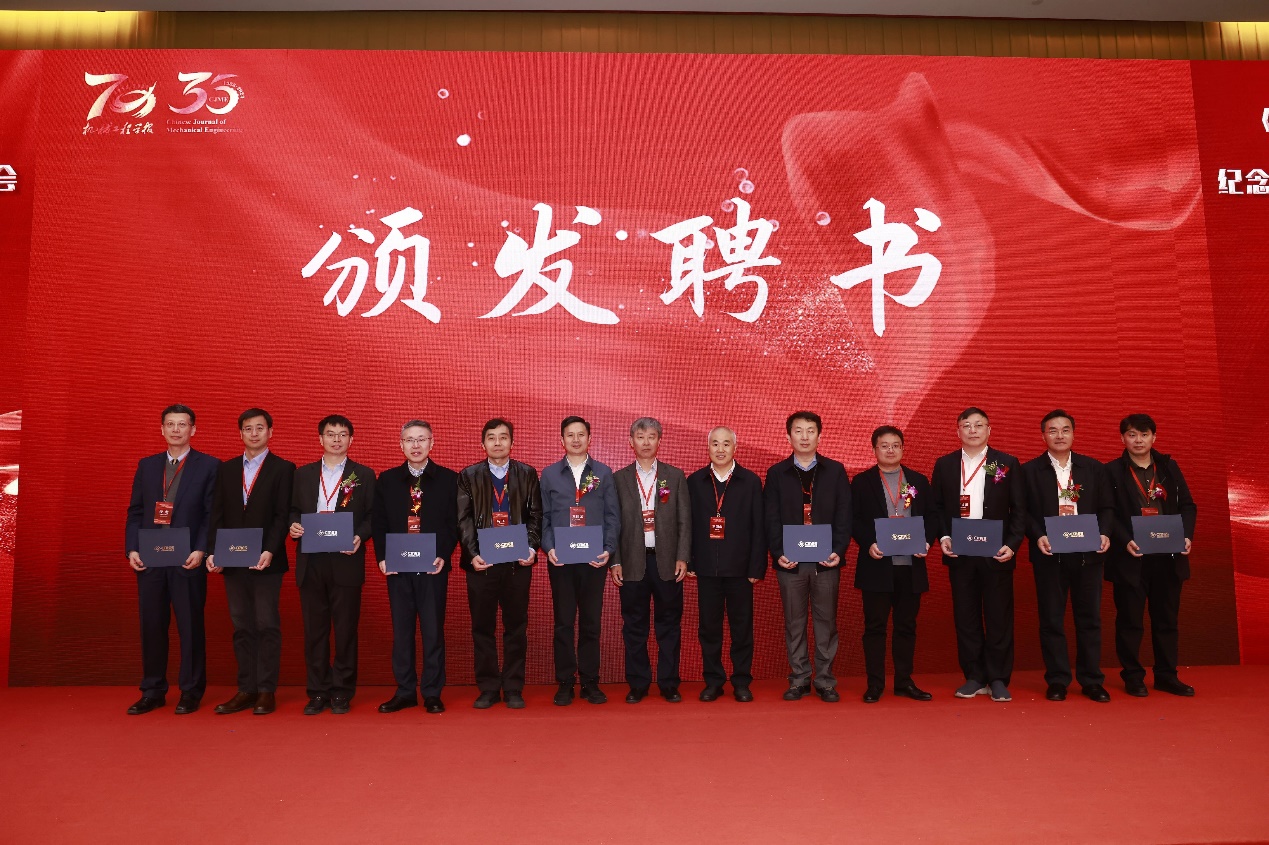 《机械工程学报》编委会副主任黄庆学、韩旭为到会委员颁发聘书(右五:黄传真)