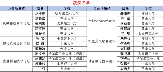 闭幕式上,机械工程学院副院长姚静鼓励参会研究生作为新时代科技创新生力军,要做到潜心钻研,厚积薄发,为推动我国科技发展贡献力量。机械设计系主任翟富刚、机电控制工程系高殿荣教授、塑性成形工程系主任翟瑞雪为获奖学生颁奖,获奖名单如下: