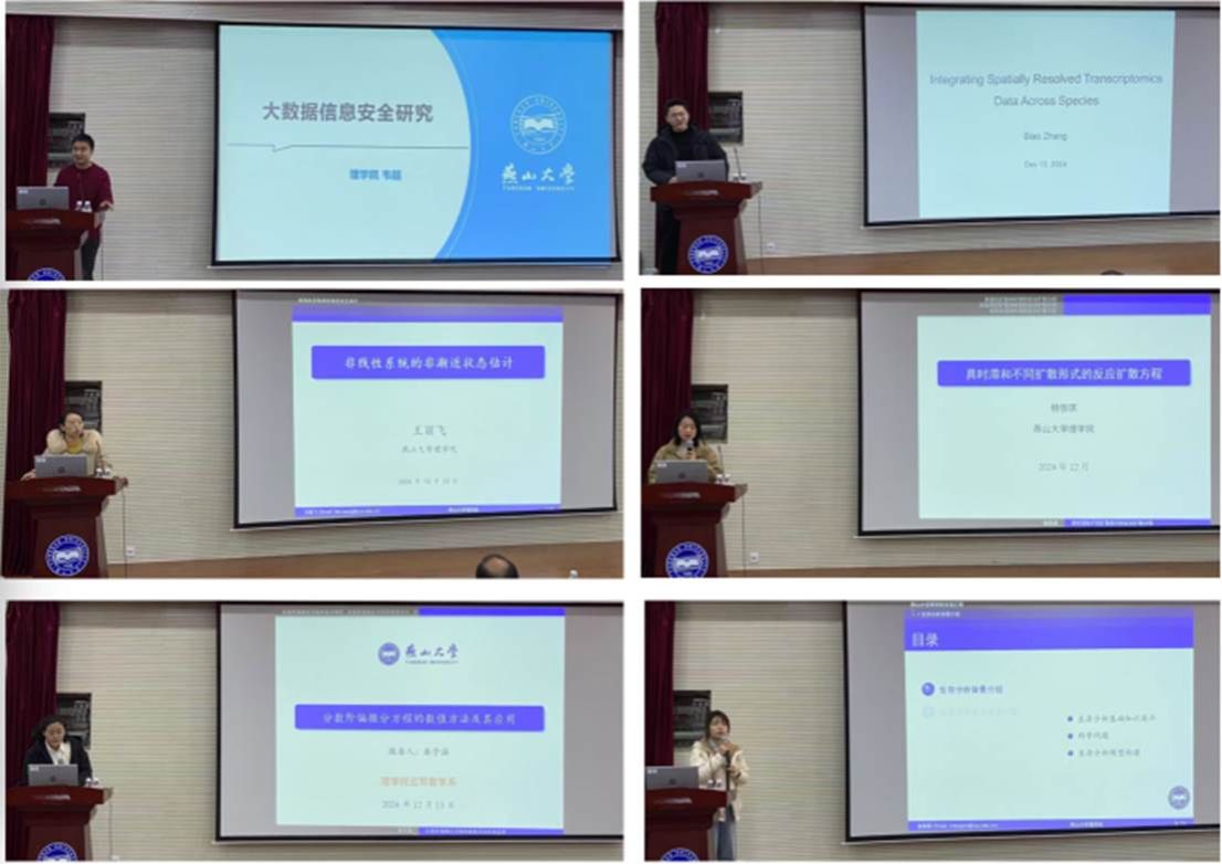 2024年12月13日下午,来自理学院的青年教师任福全、张彪、王丽飞、张希萌、杨佳琪、岳子涵在机械馆J3分别作了题为“大数据信息安全研究”“高阶有限单元法”“计算成像与图像分析”“Integrating Spatially Resolved Transcriptomics Data Across Species”“非线性系统的非渐进状态估计”“生存分析及应用”“具时滞和不同扩散形式的反应扩散方程”“分数阶偏微分方程的数值方法及其应用”的宣讲报告,6名青年教师结合自己的研究方向,深入浅出的介绍了近年来取得的研究成果及其潜在应用价值。
