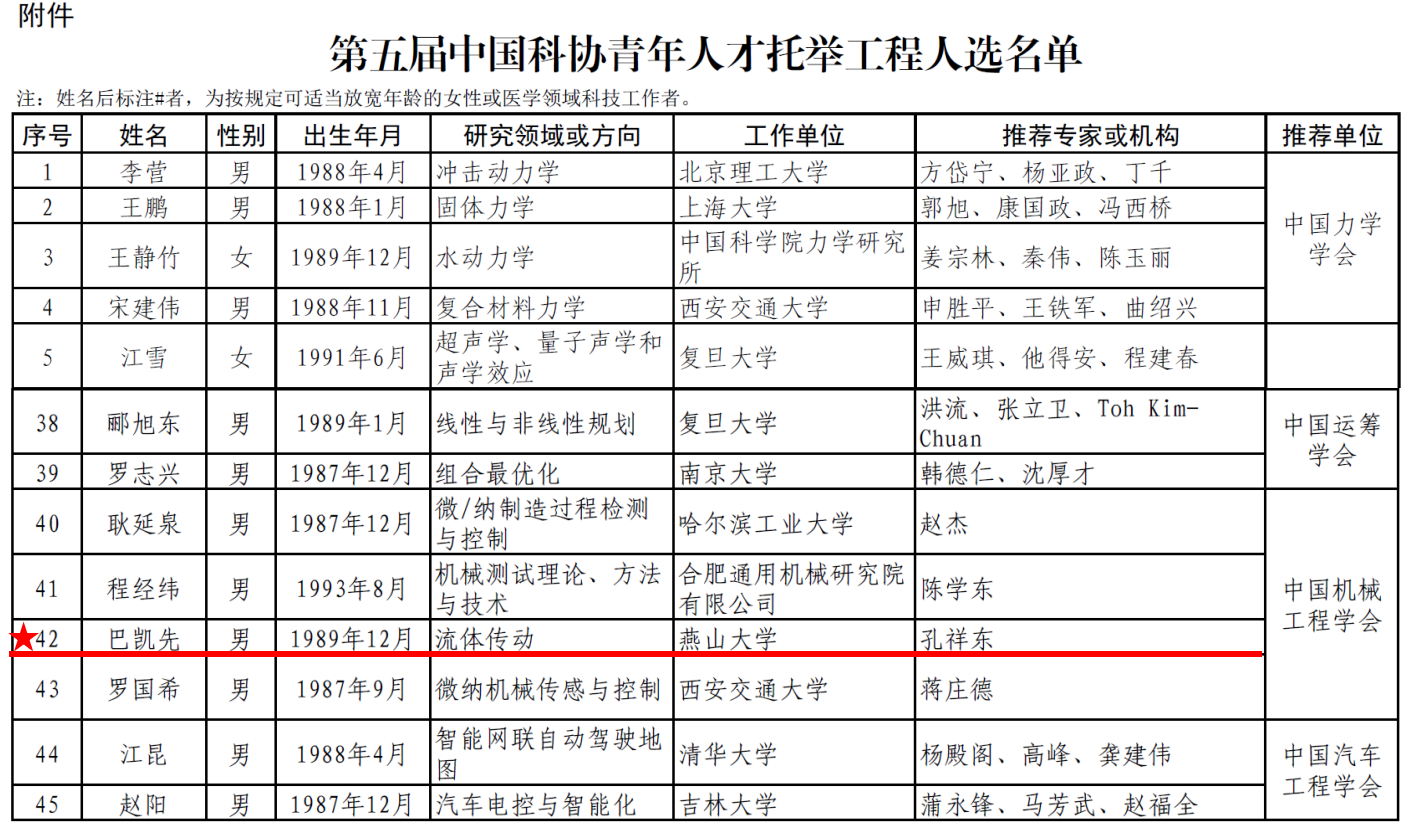 2020年7月30日,中国科协办公厅公布了第五届“青年人才托举工程”入选名单。机械工程学院孔祥东教授科研团队自主培养的青年教师巴凯先副教授成功入选。这是自该人才计划设立以来,乌鸦传媒青年学者首次入选,同时也是河北省首位由中央财政直接资助的入选者,标志着我院青年人才培养取得的又一项突破。