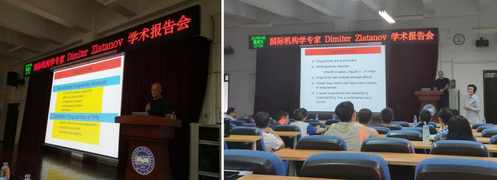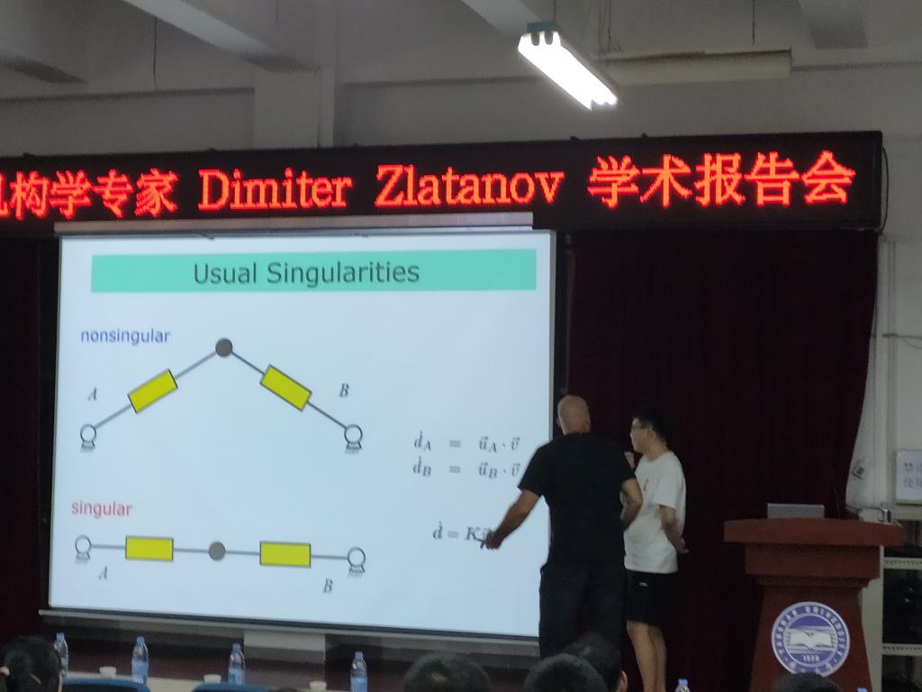 在学术报告会上,Zlatanov教授对机构学中的奇异问题进行了详细的介绍和分类,特别针对并联机器人等具有闭环运动链的机构中存在的一些不易发现的奇异类型进行了深入剖析,并介绍了代数几何、微分流形等数学工具在奇异分析中的应用。