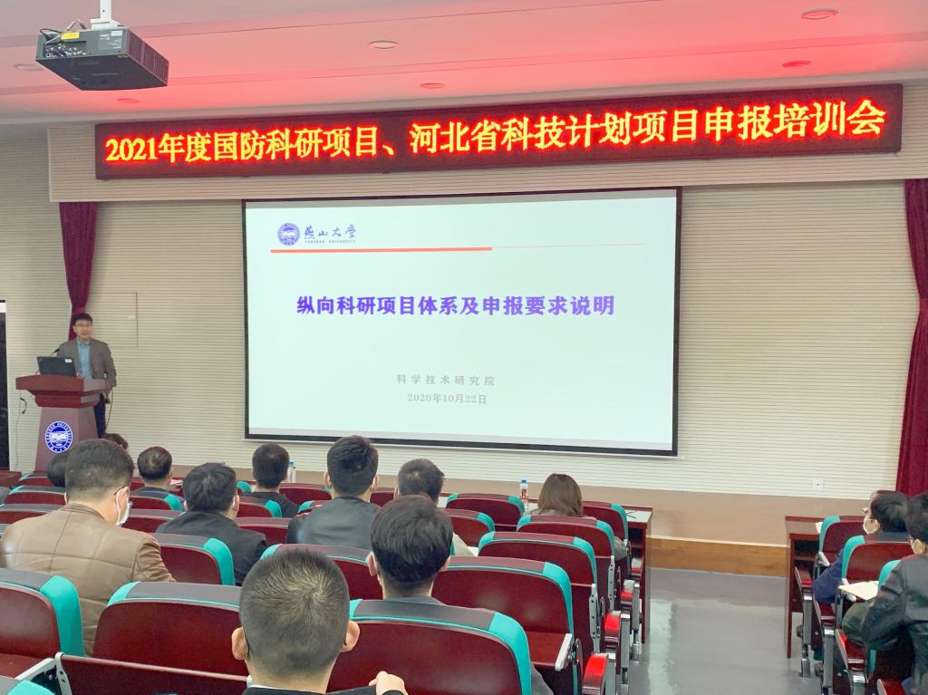 2020年10月22日下午,机械工程学院在机械馆J3报告厅举办2021年度国防科研项目、河北省科技计划项目申报培训会,培训会由姚静副院长主持,学院特别邀请了先进技术研究院副院长齐效文、科学技术研究院副院长黄华贵分别针对军工国防项目和河北省科技计划项目进行了申报培训。
