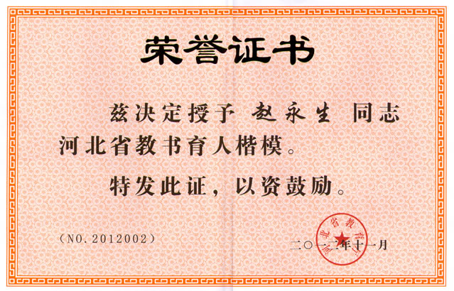 近日,河北省教育厅下发《河北省教育厅关于公布河北省教书育人楷模名单的通知》(冀教师[2012]27号),授予全省教育系统30人“河北省教书育人楷模”荣誉称号。我院院长赵永生教授位列其中。 《通知》号召广大教师和教育工作者以教书育人楷模为榜样,全面贯彻落实教育规划纲要,爱岗敬业、立德树人,严谨笃学、刻苦钻研,锐意进取、扎实工作,以人格魅力和学识魅力教育感染学生,做学生健康成长的指导者和引路人,努力推动教育事业科学发展,为建设人力资源强省、构建和谐河北做出新的更大的贡献。