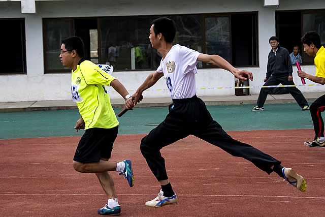 张文文(左)和董志奎(右)在4×100接力比赛中 (杜崇杰 摄)