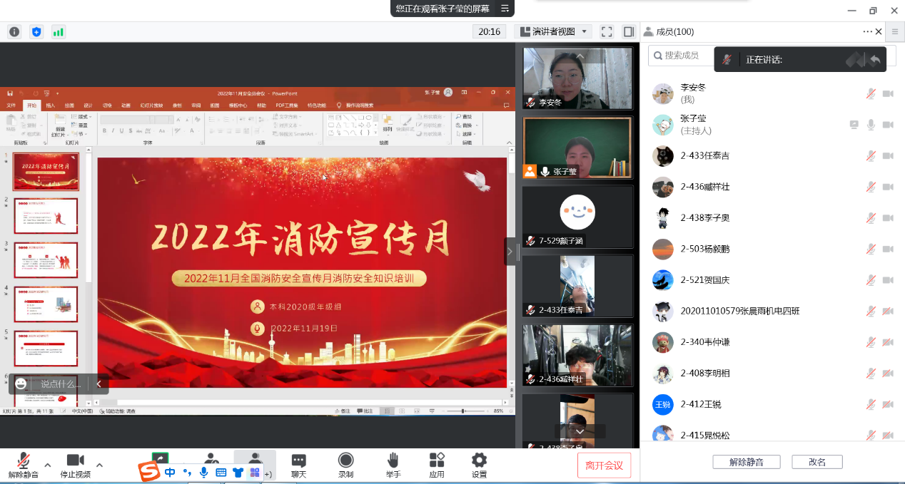 为提高学生的消防安全意识和应对火险发生时的应急处置能力,维护平安校园的环境,2022年11月19日,机械工程学院2020级本科年级组通过腾讯会议召开了消防安全培训,辅导员李安冬、张子莹、宋龙以及各班主要班委和宿舍安全信息员参加了此次培训。