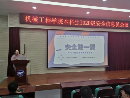 为增强学生安全意识,提高风险识别能力,创建平安校园,2023年2月23日,机械工程学院2020级本科年级组在机械馆J3报告厅召开安全信息员会议,全体信息员及各班班长、生活委员参加培训。