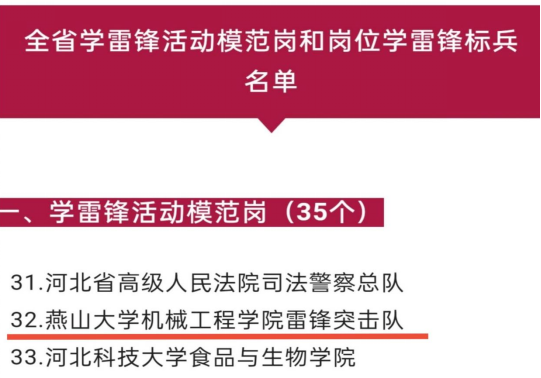 为进一步推动学雷锋活动深入开展,充分发挥先进典型示范引领作用,近日,河北省委宣传部命名35个集体为全省“学雷锋活动模范岗”、35名个人为全省“岗位学雷锋标兵”,我院雷锋突击队荣获河北省”学雷锋活动模范岗“称号。