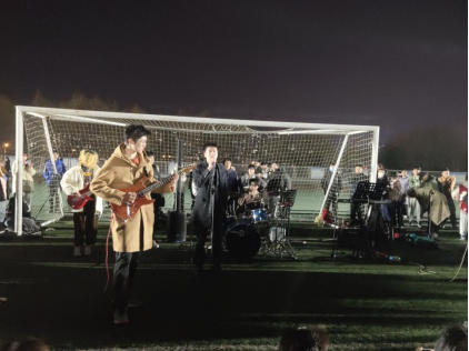 随着主持人介绍完毕,电子琴,电吉他,架子鼓,贝斯的声音同时响起,乐手随着节奏放声歌唱,海翔乐队的成员们各显神通,现场的气氛瞬间被充分调动,《蓝莲花》,《秦皇岛》,《我和我的祖国》……一首首经典歌曲韵律起伏,整个四体洋溢着青春的气息,耳熟能详的歌曲频频引发全场合唱,同学们摇晃着闪光灯,与乐团亲切互动,夜晚的寒风不能阻挡同学们的热情,活动现场气氛热烈。活动最后以钢琴独奏《奉献》结尾,长路奉献给远方,玫瑰奉献给爱情,我拿什么奉献给你……在温暖的歌声中,活动圆满落下帷幕。