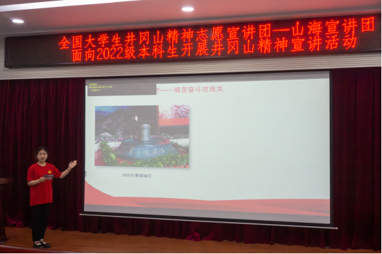 宣讲团成员苏瑛转以毛主席的《西江月·井冈山》为指引,带领同学们踏寻诗的足迹追忆井冈山革命历史和孕育其中的井冈山精神。通过莲花君子刘仁堪舍身就义后用脚蘸鲜血写下“革命成功万岁”、香港学生亵渎国歌被逐出会场的故事讲述了井冈山精神的灵魂——坚定执着追理想;通过毛泽东同志《星星之火可以燎原》文章中的对当时革命情况的分析、华为公司微创新求生存的故事讲述了井冈山精神的核心——实事求是闯新路;通过毛泽东同志只点一根灯芯的事迹创作出《井冈山的斗争》《中国的红色政权为什么能够存在》等重要文章、时代楷模张桂梅扎根贫困地区40多年立志用教育扶贫斩断贫困的故事讲述了井冈山精神的基石——艰苦奋斗攻难关;通过朱德扁担的事迹、彭德怀与人民“有盐同咸,无盐同淡”、习近平总书记在梁家河与人民群众同吃同住同劳动的故事体现出井冈山精神的精髓——依靠群众求胜利。她呼吁青年大学生勇敢肩负起时代赋予的重任,在实践中放飞青春梦想。
