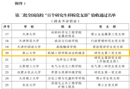 近日,教育部思想政治工作司发布第二批全国高校“百个研究生样板党支部”和“百名研究生党员标兵”创建培育工作验收结果,我院冶金机械系研究生第三党支部顺利通过验收。