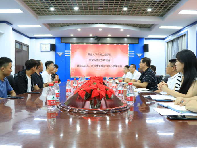 在观看学院参军入伍动员视频后,学院领导、老师同与会学生展开座谈。郝海滨对入伍同学携笔从戎、投身祖国国防建设表达了钦佩与肯定,向退伍和研支团同学表达了欢迎与赞扬。