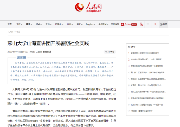 实践中,山海宣讲团发挥“学习贯彻习近平新时代中国特色社会主义思想主题教育共学堂”研学优势,多角度、多渠道、多载体地讲述习近平新时代中国特色社会主义思想,用通俗易懂的语言、群众乐见的形式将习近平新时代中国特色社会主义思想说明白、讲透彻,受众达千余人,用生动的故事,富有感染力的语言展现了燕大青年在踔厉奋发,砥砺前行中的绚丽风采。