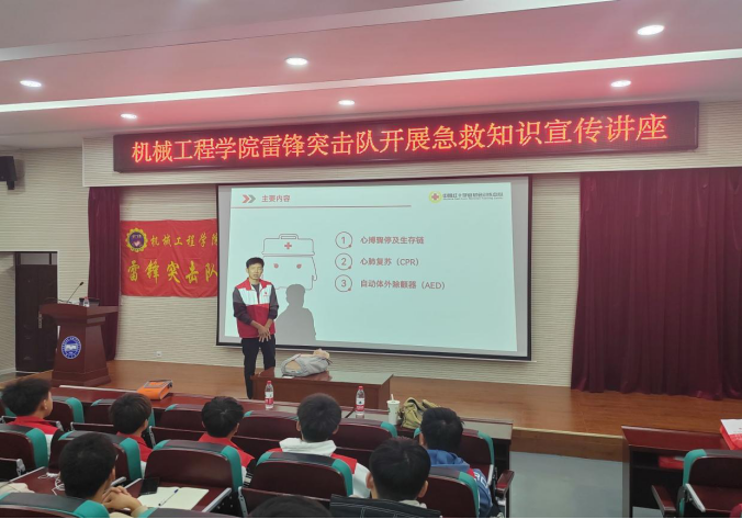 2023年11月23日晚18点30分,乌鸦传媒机械工程学院雷锋突击队在机械馆J3举办急救知识宣传讲座。本次宣传讲座特邀秦皇岛市红十字会的郑斌老师主讲,150余名同学参加此次活动。