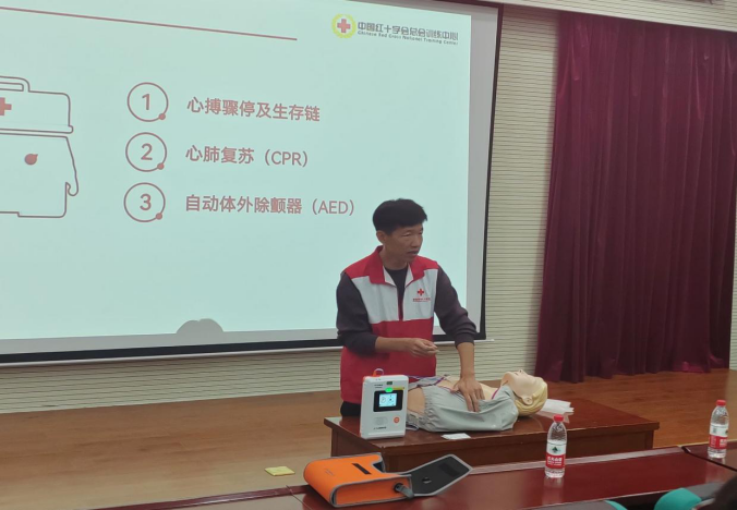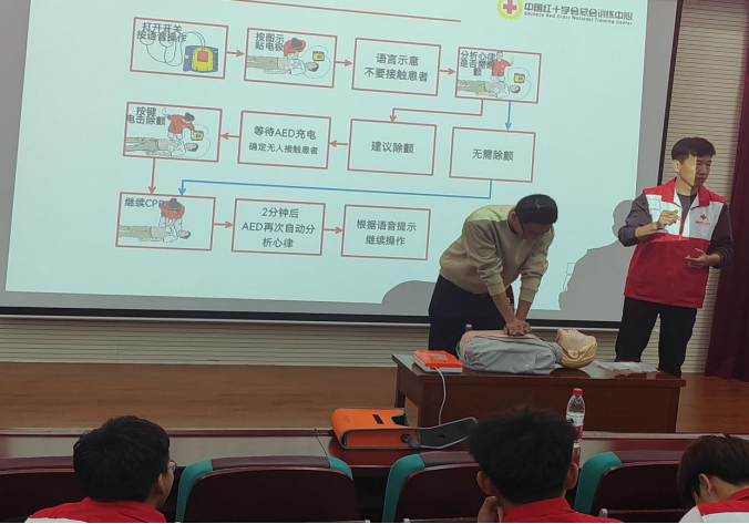 此次讲座历时两个小时。活动伊始,郑斌老师向同学们展示急救人体模型并介绍了施救的手段:心肺复苏。心肺复苏分为胸部按压和人工呼吸两部分,郑斌老师向同学们仔细讲解操作过中应注意的事项并进行详细现场操作。随后郑斌老师讲解自动体外除颤仪(AED)的用法和注意事项。讲解完毕后,在红十字会老师们的指导下,同学们亲自上台操作,将学到的急救知识学以致用。操作过程中,郑斌老师现场解答同学们的疑问,与同学们亲切互动。