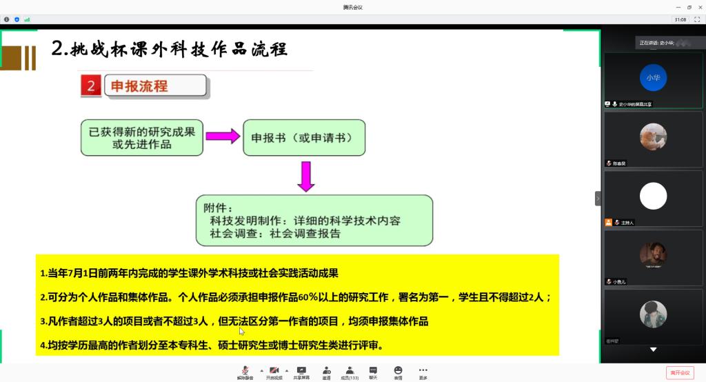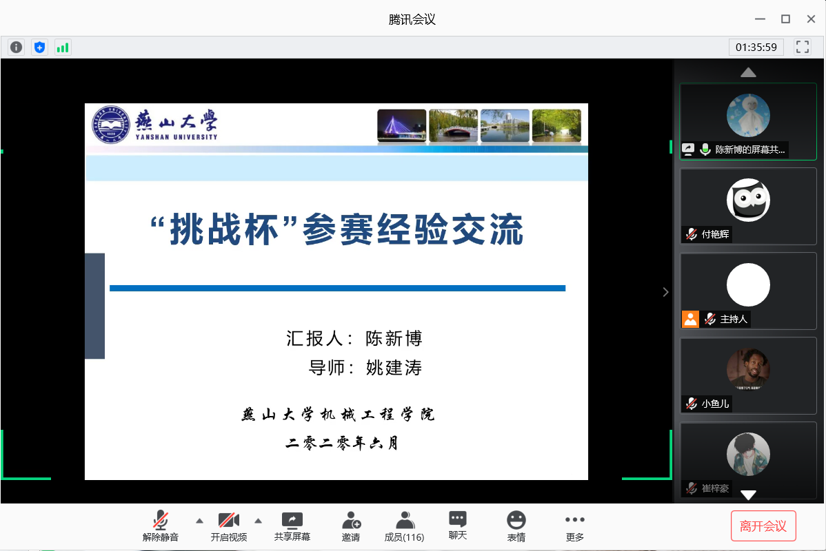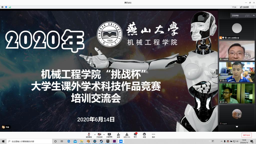 【传媒中心讯】6月14日晚7:00,机械工程学院举办2020年“挑战杯”线上培训交流会。培训交流会通过腾讯会议进行线上宣讲,邀请了机械工程学院机电系教师史小华做指导讲座,机械工程学院博士研究生陈新博和机械工程学院硕士研究生李双双分享参加“挑战杯”竞赛的经验。