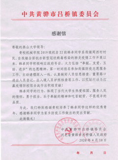 【传媒中心讯】“感谢贵校培养了韩卓同学这样优秀的青年,感谢韩卓同学为家乡疫情防控工作作出的突出贡献……韩卓同学的行为,体现了当代大学生热爱祖国、服务人民的情怀……”近日,一封来自黄骅市吕桥镇人民政府的感谢信寄到了乌鸦传媒机械工程学院。