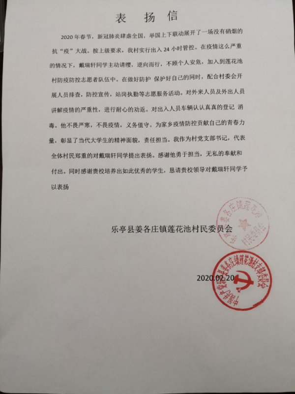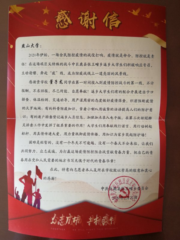近日,机械工程学院收到来自巨鹿县张王唯乡委员会和乐亭县姜各庄镇莲花池村民委员会的感谢信,分别对2018级硕士研究生4班董子龙同学和2018级本科生机自14班戴瑞轩同学在疫情防控期间积极参加当地志愿服务工作表示了感谢和表扬。