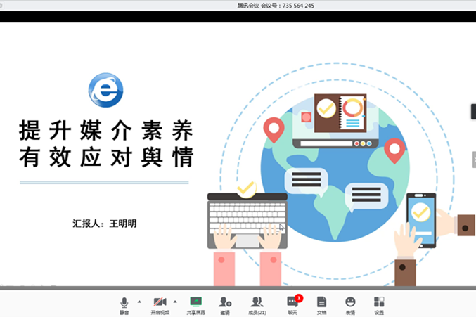 本次学习借助腾讯会议软件,以PPT实时分享的方式展开。学习紧密结合大学校园的舆情案例、翔实数据和学生工作,向大家阐述了媒介素养的重要性,深入分析了当今校园网络舆情的类型和特点,并对如何提高校园网络舆情的应对能力进行了系统的讲解。