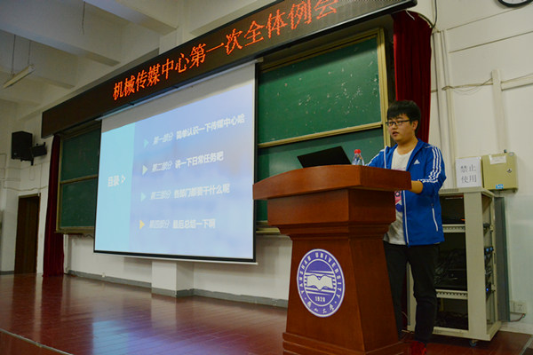 会议在主持人的精彩开场和精美的PPT的展播中拉开了帷幕。会议包括以下几项内容:首先各部门成员进行自我介绍,传媒中心各部门干事的责任心和对待新成员的态度让会议气氛变得轻松活泼。各个新成员的自我介绍丰富且精彩,为我们展示了2019级新生广泛的兴趣和渴望把机械传媒中心发展的越来越好的雄心壮志,让我们看到了传媒中心美好且灿烂的未来。其次,各部部长为新成员介绍了各部门工作计划,摄影部、采编部、视频部、网络部、秘书部分别从工作分工、授课计划、活动安排、工作计划,还有其他一些方面介绍了各个部门负责的工作及分工,为以后新成员能更好地融入机械传媒中心的工作中奠定了基础。各部门部长热情洋溢,陈词铿锵,赢得了同学们的一阵阵掌声。最后,李宇宵主席详细介绍了传媒中心的职责,讲解了日常任务和各部门的分工,他严肃而又不失风趣的讲话,让同学们深刻地体会到了机械传媒中心的精神,为会议划上了一个圆满的句号。