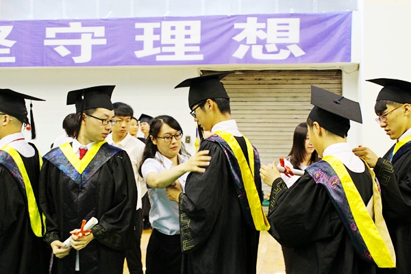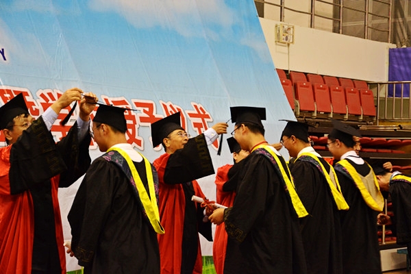 毕业典礼结束后,学院领导及教师代表亲手为毕业生拨流苏、授学位,并合影留念。