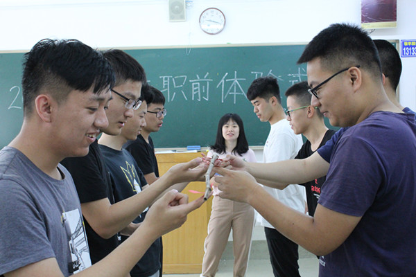 本次毕业生素质拓展与入职教育培训为期两天。第一天的培训主题为“破冰行动”,并围绕此主题开展“石头剪刀布”、“乌鸦落网”和“信息接龙”等破冰游戏。在游戏中,辅导员老师将毕业去向相近的毕业生分为一组,让他们记住各自的名字和工作单位等重要信息,并依据这些信息展开游戏。辅导员老师通过这种方式让就业地点相近的毕业生之间加强联系,方便他们在今后的工作中彼此帮助,相互扶持。第二天的培训以“红黑商战”为主题。辅导员老师把同一毕业去向的学生随机分为两组,分别扮演两个对立的公司,进行模拟对抗。游戏从开始的互不相让,激烈的讨论、决策、谈判和博弈到最后的达成共识、互利共赢,共同完成游戏。辅导员老师通过游戏告诫毕业生们不要绞尽脑汁想办法置对手于死地,而要学会互利共赢,这才是当今社会生存的最佳方法。