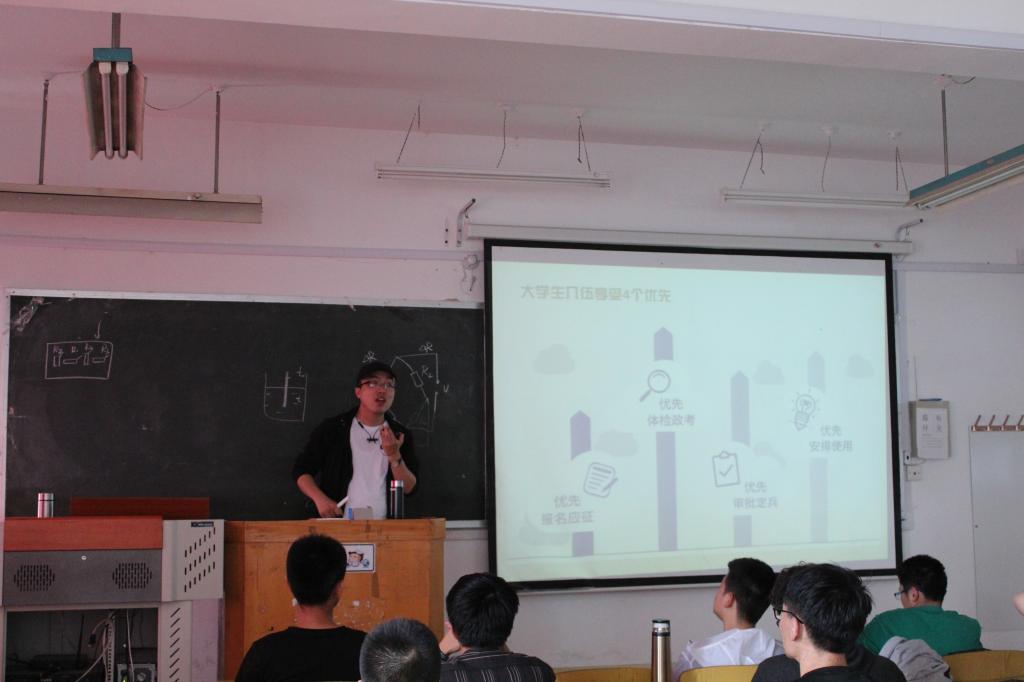 本次宣讲会旨在为我院学生讲解大学生参军入伍的各项政策与要求,让有参军意愿的学生做到心中有数。宣讲会在提振士气的宣传视频中开始,让同学们感受到中国军人的魅力与风采。正式开始后,崔博凯老师为大家介绍本次宣讲会的基本内容,向大家讲解参军的基本身体素质要求。接着是参军政策方面,大致介绍了大学生参军的优先条件与大学生参军有关的各项政策。随后在报名细节方面,崔老师重点强调了几个报名时需要注意的问题。最后,四位退伍归来的校友与现场学生进行互动,气氛热烈。