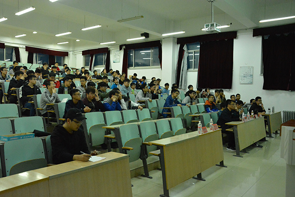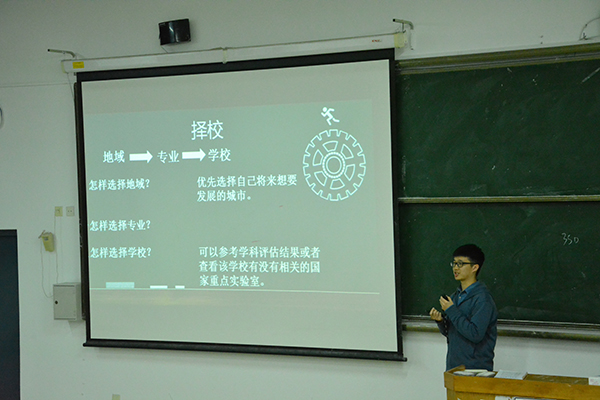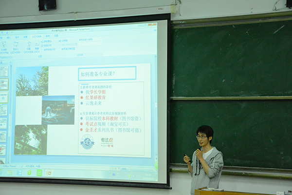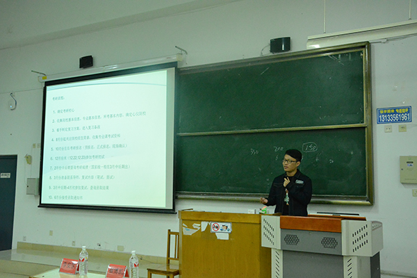 首先进行经验交流的是考入天津大学的王杰文同学,他从如何择校,如何准备专业课,复试经验与教训和感悟勉励四部分,向同学们传授了自己的感悟与经验。然后是考入哈尔滨工业大学的王文博,就考研政治做了重点讲解,他讲解了初试政治题型,分享了自己准备选择题所用的材料书籍,并结合自己的经历给同学们提出了考研复习的时间分配安排,其幽默风趣的交流风格赢得了同学们的阵阵掌声。王文博向同学们推荐了考研相关的公众号,以帮助同学们更好的制定自己的复习计划,并介绍了哈尔滨工业大学的往年招录情况。考入重庆大学的胡靖华同学重点向同学们分享了考研英语的复习经验,考入西北工业大学的刘金花同学则是重点分享了高数复习经验。