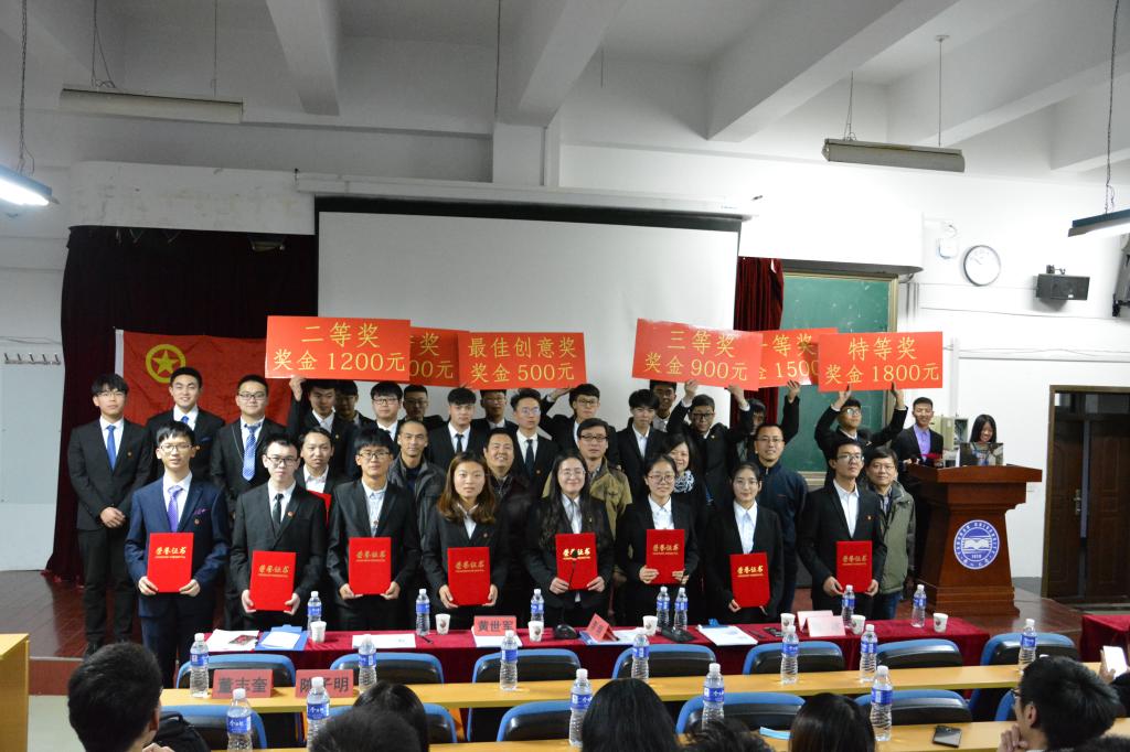 答辩结束后,郝海滨副书记作了精彩的总结点评,他对于各组的优秀作品给予肯定,他勉励大家继续坚持不懈地参与科技创新活动,正确认识比赛,比赛不仅仅是为了获奖,重要的是通过比赛锻炼动手能力,提升自己,为以后步入社会打下坚实的基础。最后,大赛进入颁奖环节,其中,闫家辉组的“立式回转倒料机”获得最佳创意奖,李智组的“自动转运倒料机”获得特等奖,李海平组的“抓取转运倒料机”和闫家辉组的“立式回转倒料机”获得一等奖。