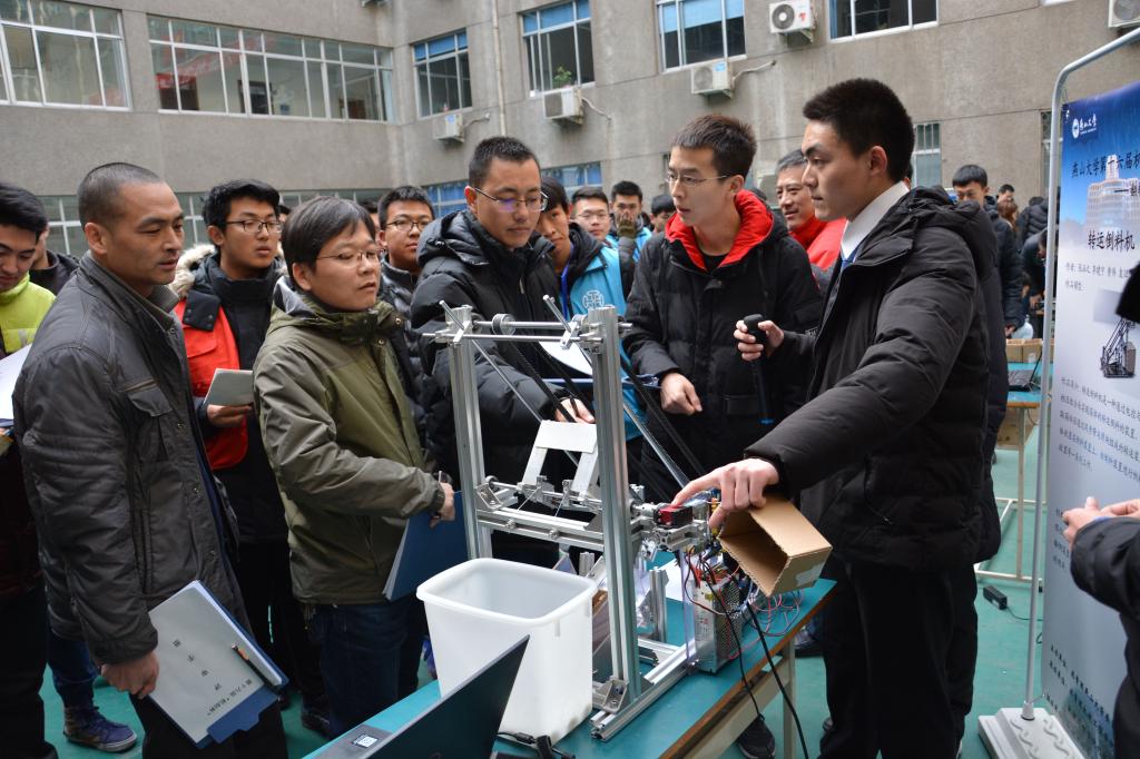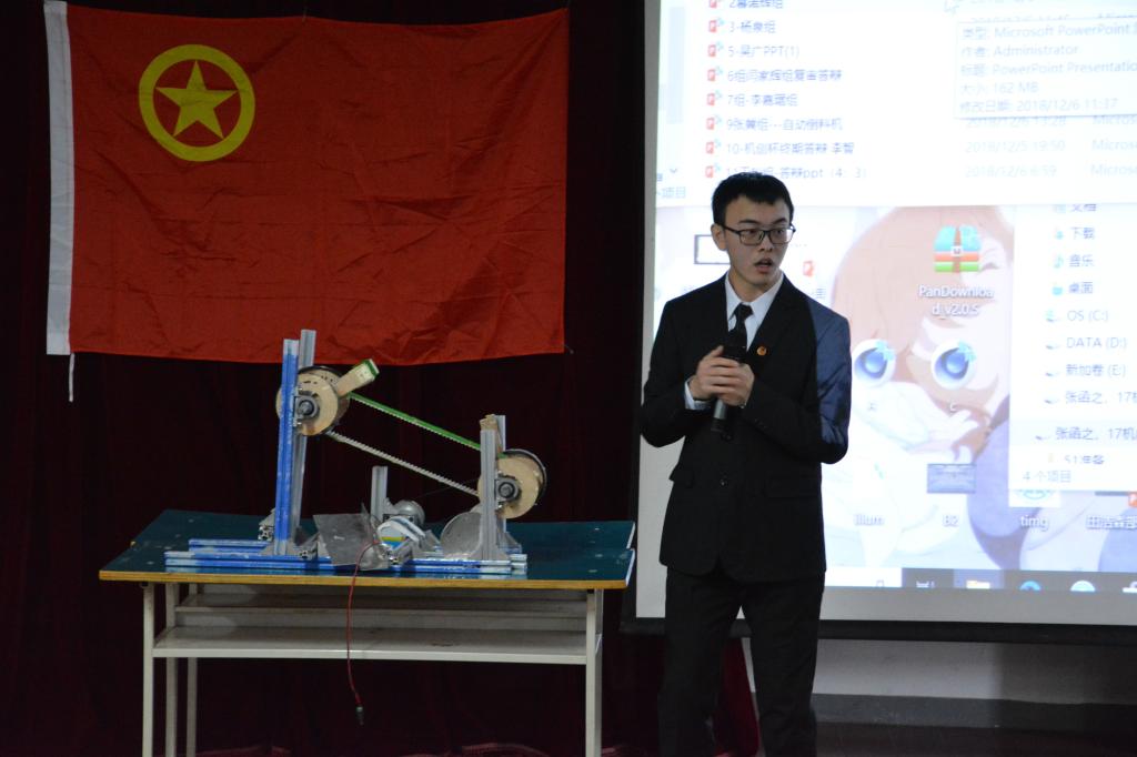 此次的决赛分为作品展示和答辩两个环节。作品展示环节在机械馆天井举行,各参赛小组将作品带到现场,用实际运行方式向各位评委老师展示自己的成果,每一件作品都蕴含了参赛选手们的心血。答辩环节在机械馆J3报告厅进行,各组负责人登台介绍了自己的作品,并通过PPT讲解的方式全面介绍自己的作品。评委老师从装置构造、装置原理、设计思路、操作方式等方面进行提问,并给参赛选手提出了改进思路。其中,闫家辉组的“立式回转倒料机”通过可叠加多个机爪的方式提高工作效率的设计让人眼前一亮,王钊组的“自动转运倒料机”凭借接近全自动的作业和可直接应用于工厂流水线上的优势获得了好评,蒲长林组的“智能搬运工”十分稳定地运行,赢得了评委老师的称赞。