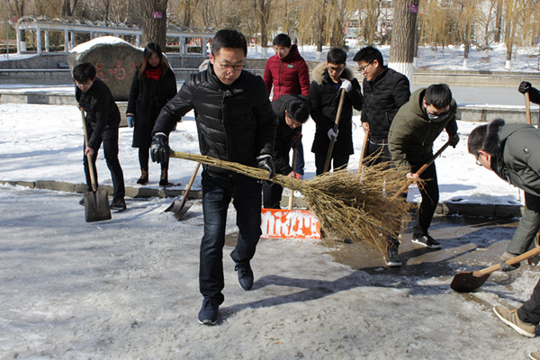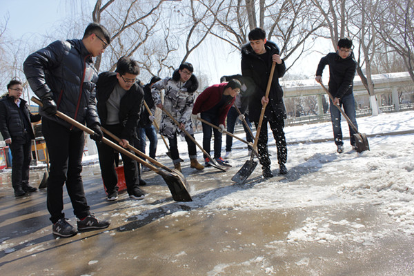 为保障全校师生出行安全及校园道路的畅通,机械工程学院在3月8日早上组织研究生党员和入党积极分子对校园内积雪开展清理。大家纷纷拿上铁锹、扫帚等除雪工具,投入到扫雪除冰的行动中。雪带着寒意,风吹得刺骨,师生紧握铁锹的双手磨出了水泡,但在校园扫雪的同学们鼻子上都冒着细细的汗珠,脸上洋溢着幸福的微笑。