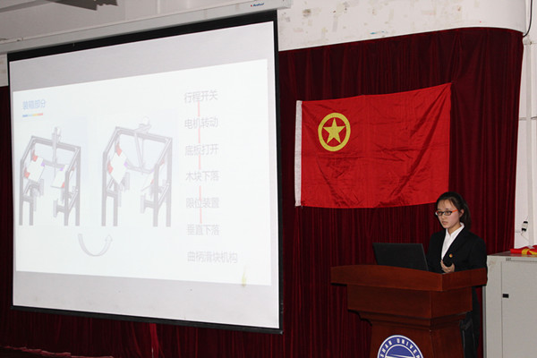 首先为作品展示环节,参赛选手在机械馆天井中向评委老师及同学们展示自己的作品并且做了简单的介绍,并在现场运行各自的装置。参展作品共有十二件进入决赛,每一件均有独具匠心之处。答辩环节在机械馆J3教室进行,各组负责人登台答辩并进行PPT展示,在PPT中,同学们形象生动的展示出自己作品的各个方面,在答辩结束后,评委老师们从装置构造、装置原理、设计思路、操作方式和视频展示等方面来进行提问,并为学生提供了改进的思路和建议。