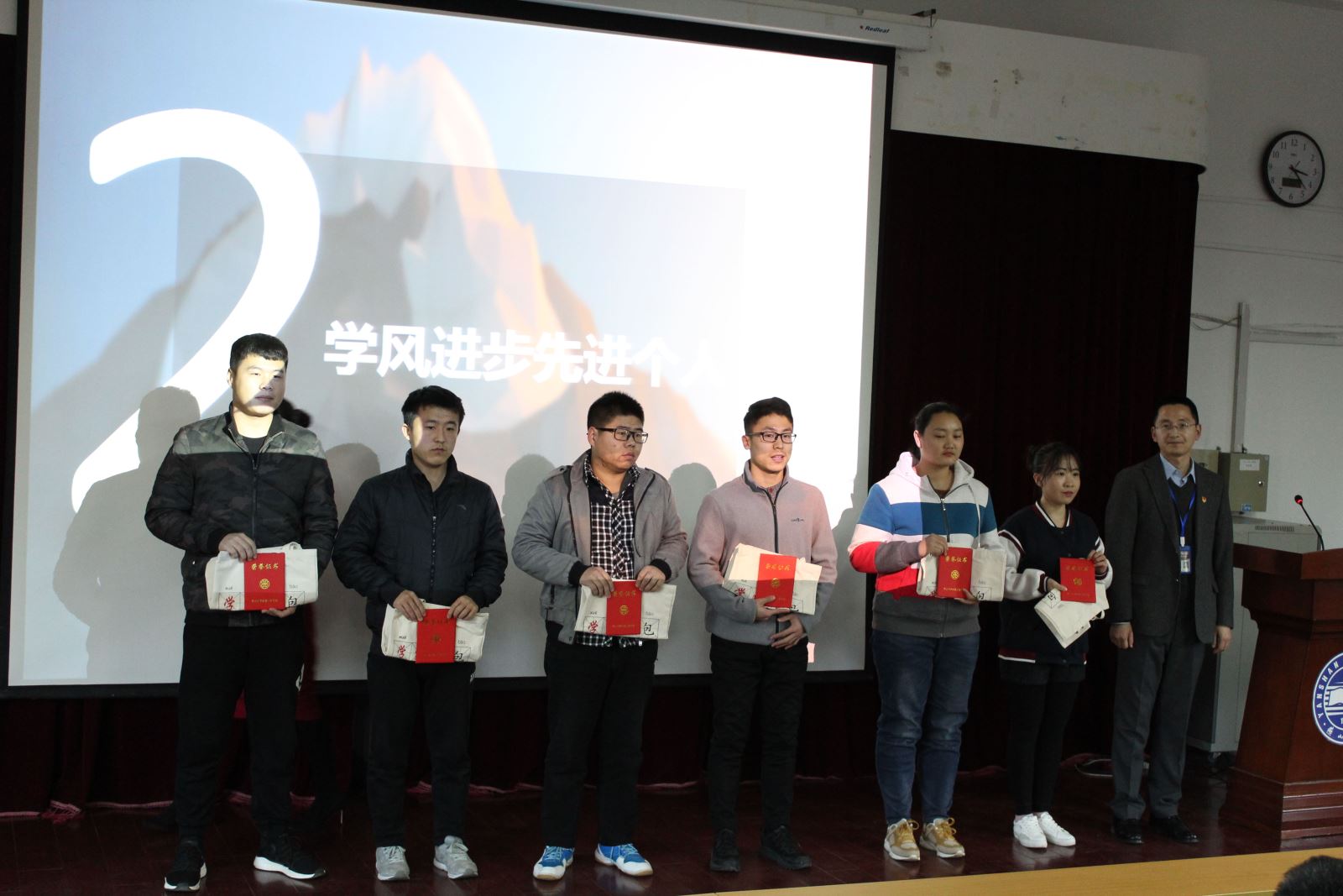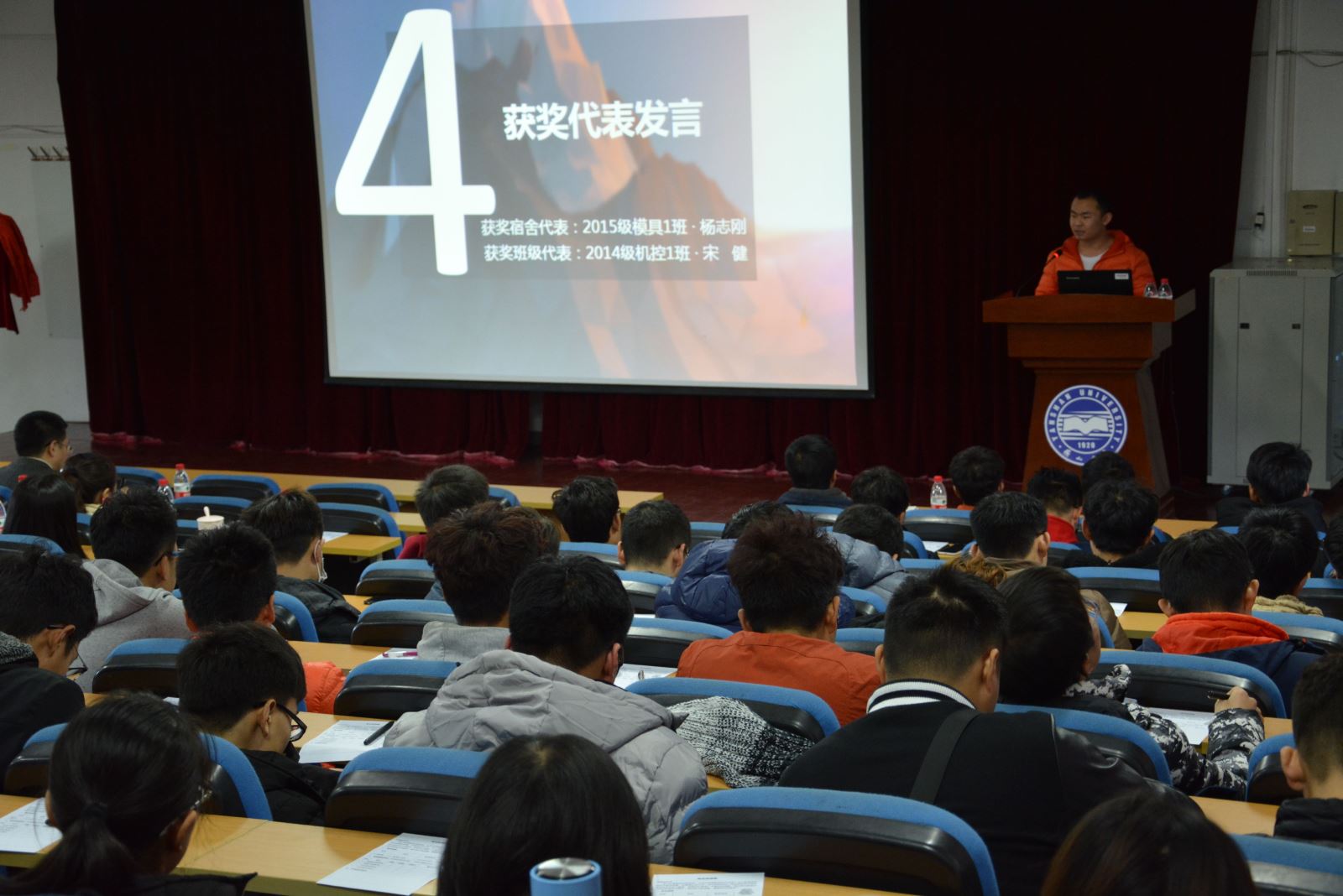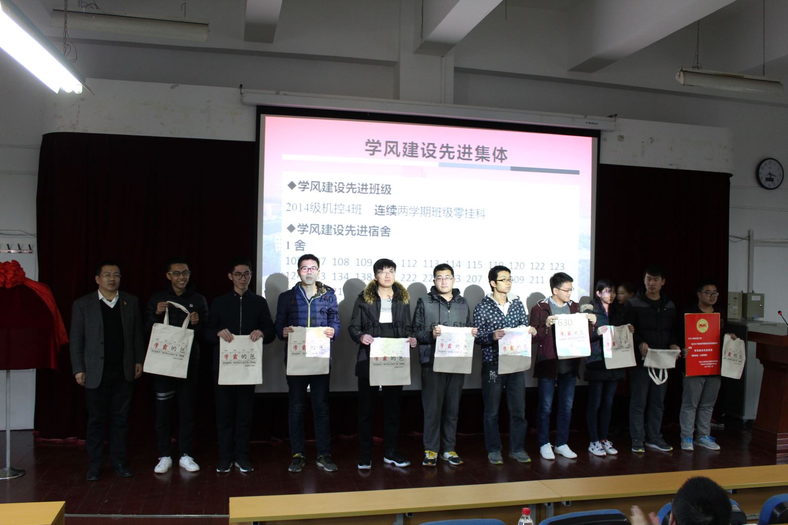 首先,学生工作处副处长产佳宣读了优秀学风先进个人名单,介绍了他们的学习进步名次及获得荣誉,并对获奖同学表示祝贺。随后为学风先进个人代表颁奖,机械学院党委书记蔡星周宣读了学风建设先进集体名单,并为获奖班级学生代表与获奖宿舍代表颁奖。获奖寝室学生代表杨志刚和获奖班级学生代表宋健发言,两位学生代表将自己身边的故事及自己的经历分享给同学们,风趣而不失深度,学生们感触颇深。杨志刚同学鼓励同学们将宿舍营造成一个互相包容、互相帮助的集体,而宋健同学告诉同学们没挂过科的大学才是完美的大学,选择什么,收获什么。郝海滨副书记随后总结本学期学风建设情况,介绍了学生学习与发展指导中心的成立原因和主要工作职能及其重要的意义。最后,蔡星周书记发表饱含情感的致辞,他高度称赞了学风建设取得的成绩,并对获奖学生表示祝贺,同时给予同学们深切的教导,告诫同学们修身,鼓励同学们求知若渴、做更优秀的自己,讲话饱含对青年学子的希望,给同学们带来莫大的鼓励。