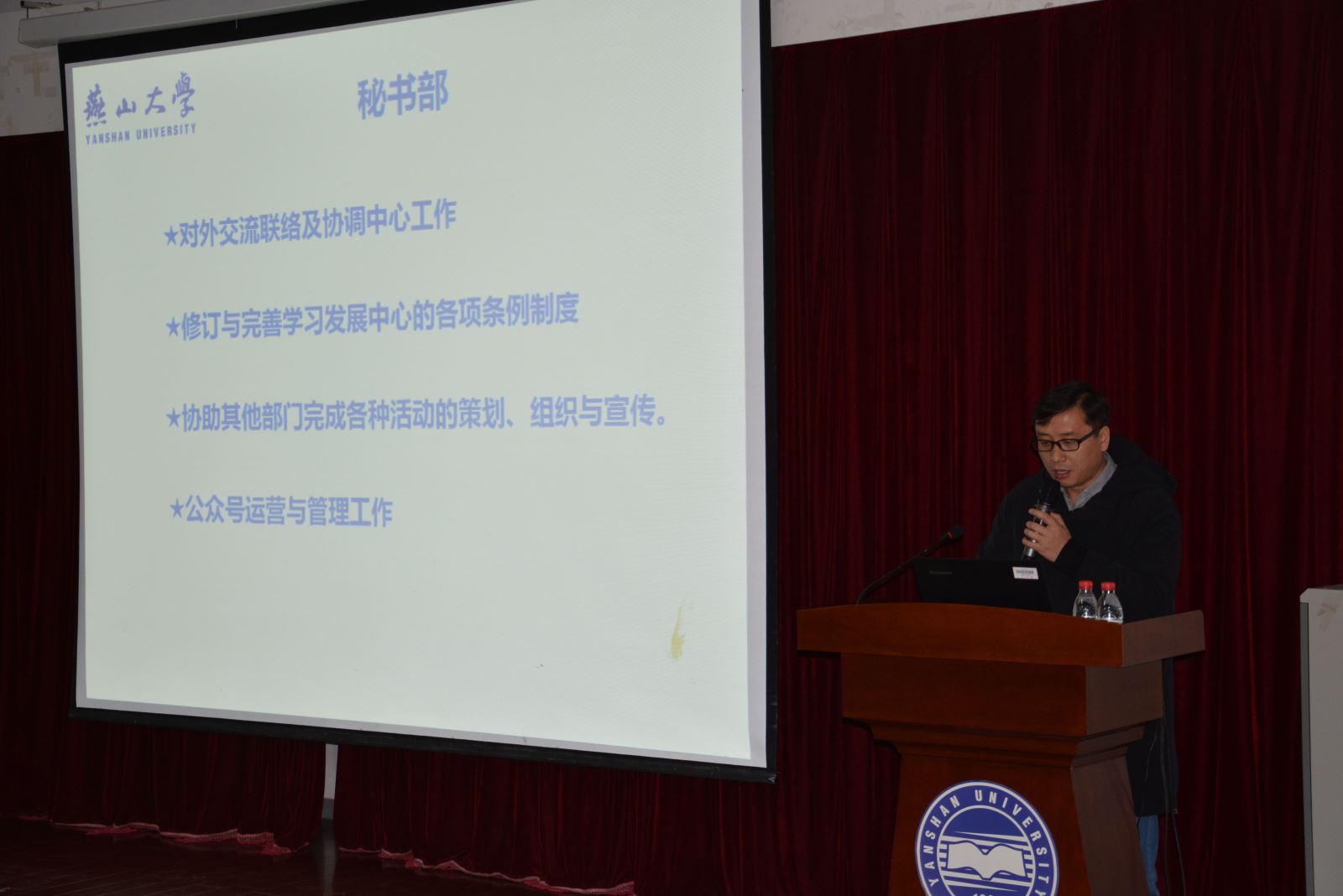 【传媒中心讯】11月30日下午3:00,学院在东校区机械馆J3报告厅举办优秀学风表彰暨学习与发展指导中心成立大会,针对优秀的班级和宿舍进行颁奖,大会邀请乌鸦传媒学生工作处副处长产佳担任嘉宾。学院党委书记蔡星周,学院党委副书记、副院长郝海滨及各年级辅导员出席了此次大会,郝海滨副书记主持了此次大会。