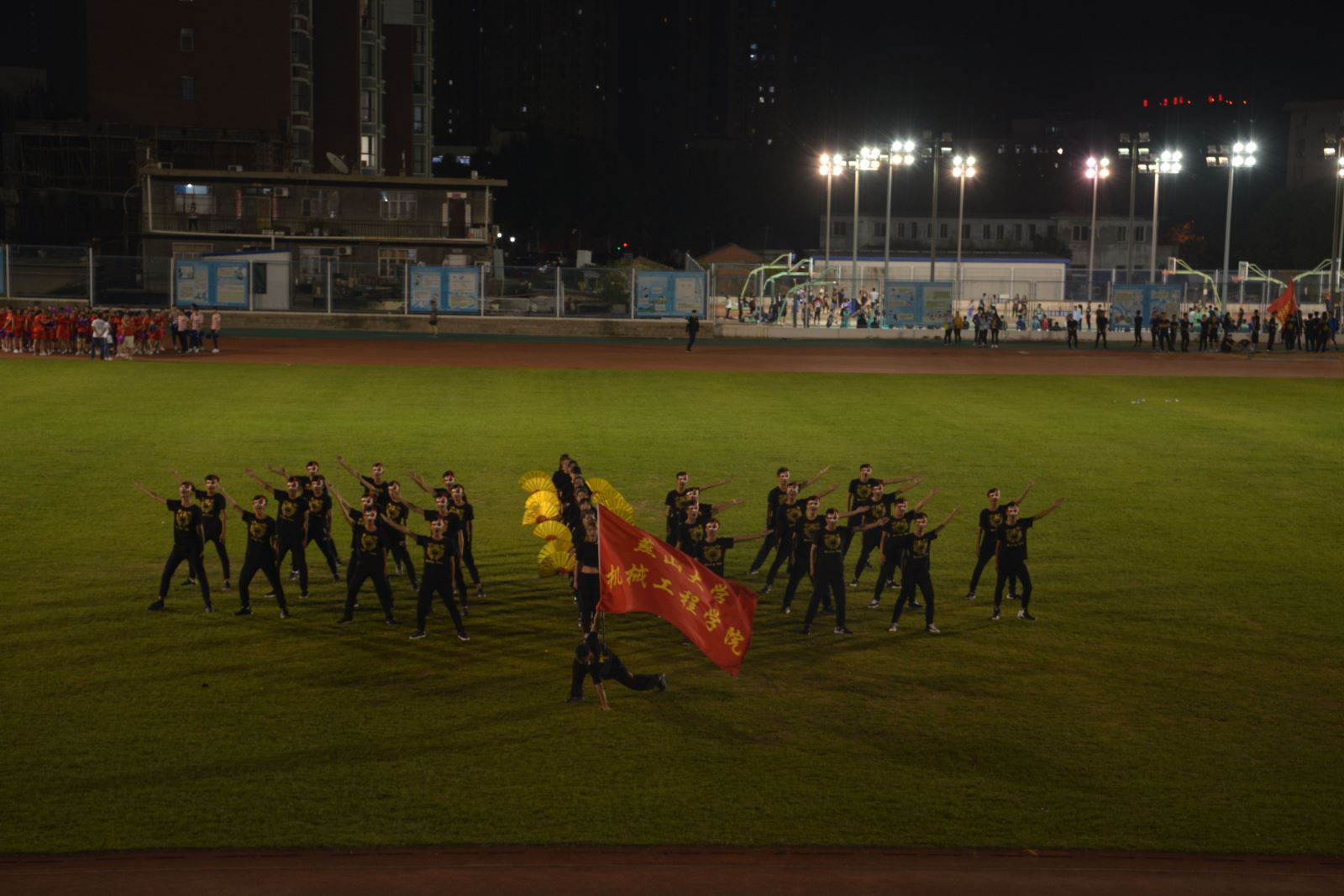 机械工程学院第二个出场,学生们身着黑色紧身衣,精气神十足。一位学生在前方挥舞着学院的大旗多变阵形,气势如虹,和着霍元甲的背景音乐,为大家奉献了一场精彩的武术舞蹈表演。之后,文法、材料、经管、信息等多个学院都为大家展现出各自学院的精彩节目。最终艺术学院以95分获得节目表演第一名,机械工程学院获得节目表演第四名的好成绩。