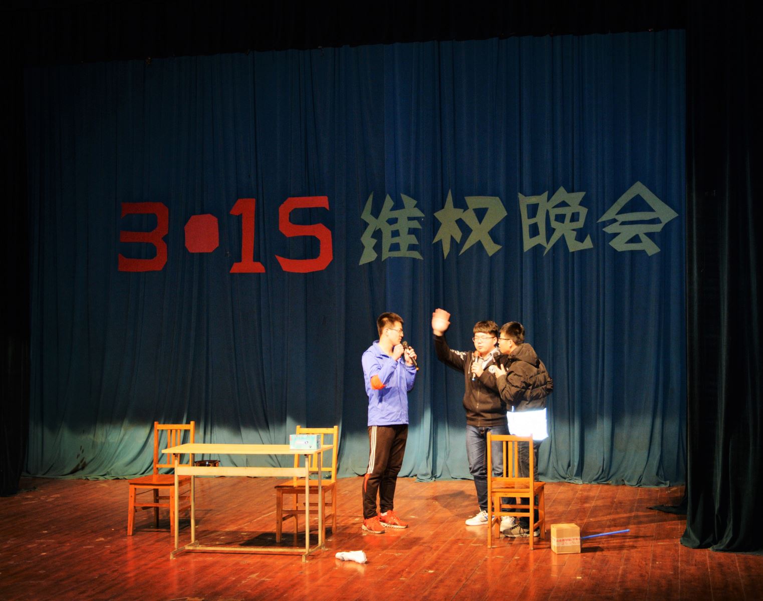 晚会在主持人做简短的开场白后开始,首先是小品《修电视》作为一道“开胃菜”,让观众渐入晚会的佳境。接下来的节目是极其精彩的相声表演《“鞋”不压正》,两位学生的配合相得益彰,流畅自然,对食品安全问题进行了深刻的讽刺。逗哏滔滔不绝地逗乐,捧哏默默地配合,一唱一和,引得观众阵阵掌声。下半场的《网购轶事》,内容是关于网购中的一些问题,并且以男生向心仪的女生表白为背景,更增添了节目的效果。还有《海参炒面》、《皮皮虾去哪了》、《不骗白不骗》等精彩的节目,均是紧扣3.15维权的主题。最终,黄海君、张豪辉共同表演的相声《“鞋”不压正》获得了本次晚会的一等奖。