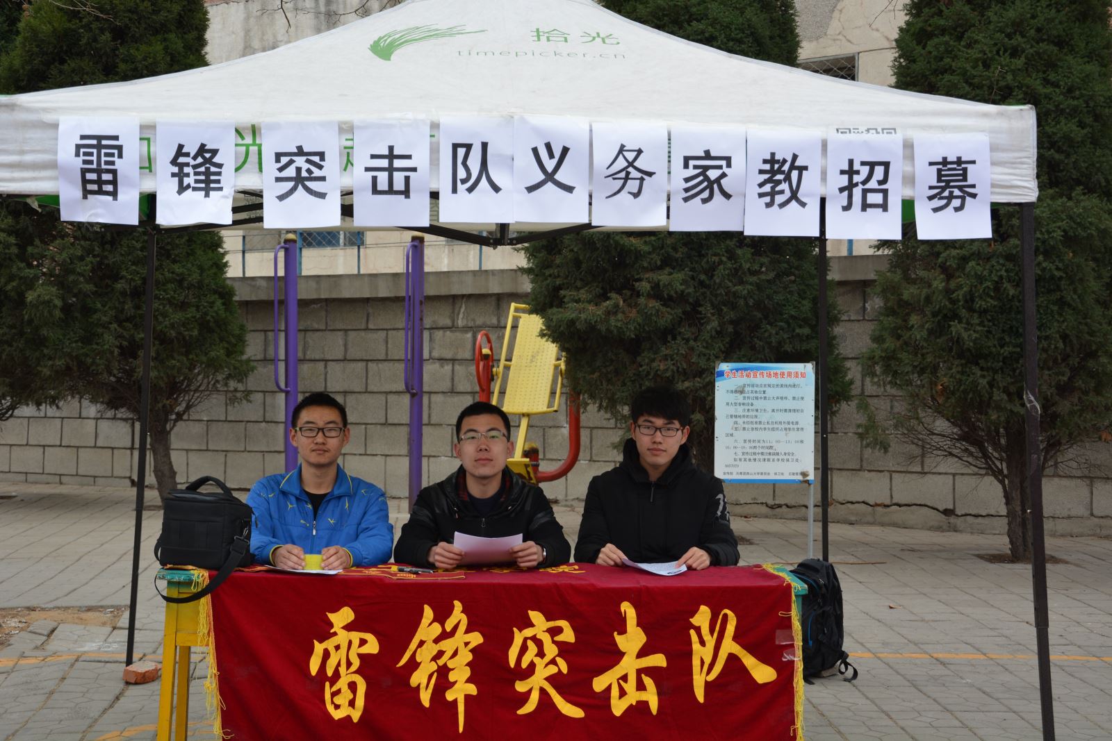 20日和21日两天,雷锋突击队在二食堂和三食堂前宣传义务家教活动,鼓励同学们利用自己的课余时间,奉献自己,做有意义的事。义务家教是雷锋突击队的一项传统活动,经过十余年的努力,该活动已经具有了一定的影响力。这个影响力包括两方面:一方面是对校外的影响,很多家长期盼着义务家教活动开展,及时报名;另一方面是对校内的影响,许多同学都慕名而来,想奉献自己,帮助学弟学妹们。一名前来报名的同学说表示非常想参加义务家教活动,他说:“以前上初中的时候,有个大学生给自己讲题,非常感激他。现在上大学了,也想帮助像他一样帮助学弟学妹们。”爱心就是这样传递下去的,在这个传递的过程中,同学们会体会到奉献的乐趣。