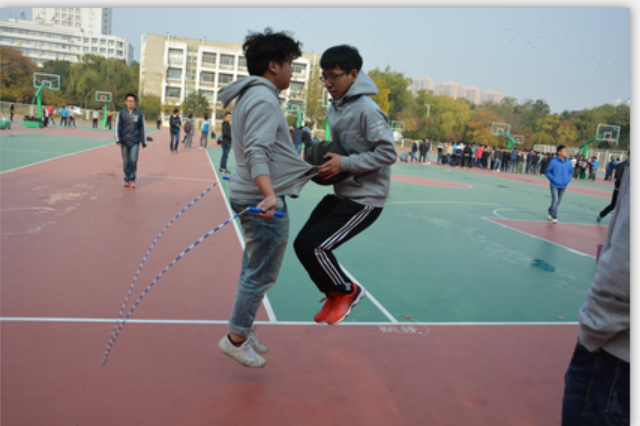 同学们在进行抱球跳绳环节